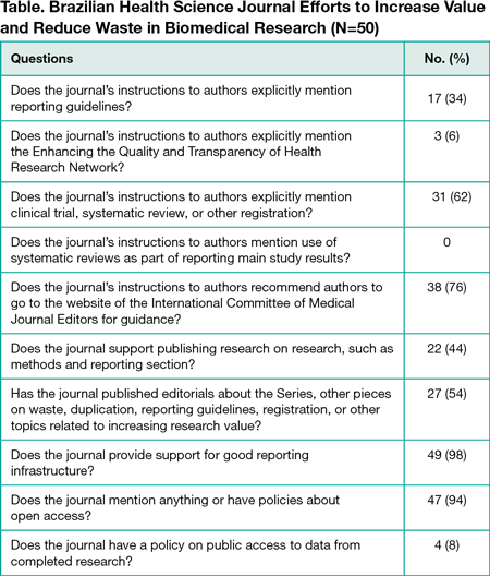 The search retrieved 60 journal titles, and 10 were excluded: 5 not Brazilian, 4 related to basic sciences, and 1 duplicated. Of the 50 journals investigated, 27 had an Impact Factor (median, 0.937; interquartile range, 0.730-1.194), 48 had a SCImago Journal Rank (median, 0.356; interquartile range, 0.268-0.528) and 48 informed their H-index (median, 22; interquartile range, 12-35). Half (25) publish bimonthly. No submission or publication fee is required by 33 journals. Other indexing databases were, in order of frequency: LILACS, Scopus, and SciELO. No Brazilian journal met all 10 questions on efforts to increase value and reduce waste (Table). The median of items fulfilled was 5 (maximum, 8 [2 journals]; minimum, 1 [1 journal]). All except 1 of the journals provide support for good reporting infrastructure, 46 are open access or have policies for it, 39 recommend authors visit the International Committee of Medical Journal Editors website, 32 mention mandatory registration of clinical trials or systematic reviews, 14 mention the use of reporting guidelines, and 3 mention the Enhancing the Quality and Transparency of Health Research (EQUATOR) Network. None mention systematic reviews as part of main study results. There was a significant negative association between journal’s SCImago Journal Rank and scores for reducing research waste (β = –2.73; P = .04). There were no significant associations between the journal scores and the other bibliometric measures.