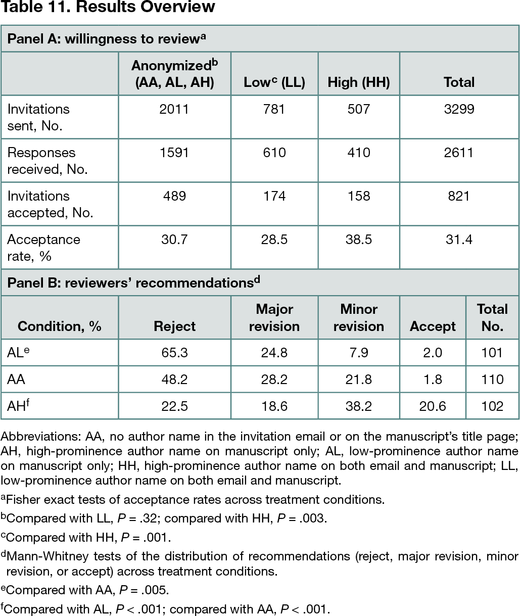 A manuscript written by Vernon Smith (Nobel laureate, high prominence) and Sabiou Inoua (young researcher, low prominence) was submitted to the Journal of Behavioral and Experimental Finance for peer review. The paper was assigned to 3299 reviewers randomized into 5 conditions: (1) no author name in the invitation email or on the manuscript’s title page (treatment: AA; 576 reviewers); (2) high-prominence author name on manuscript only (AH; 696); (3) low-prominence author name on manuscript only (AL; 739); (4) high-prominence author name on both email and manuscript (HH; 507); and (5) low-prominence author name on both email and manuscript (LL; 781). To avoid confounding, only 1 name was shown in the email and on the manuscript, and the author was always designated as the corresponding author. Reviewers gave consent to being part of the study prior to accessing the paper. Those who submitted a report were debriefed after the study. Reviewers’ decisions to accept the invitation in response to anonymized (AA, AH, AL) vs nonanonymized (LL, HH) emails were compared using Fisher exact tests. The distribution of publication recommendations (eg, reject, major revision, minor revision, or accept) was compared for manuscripts that showed the author’s name (AL, AH) vs those that did not (AA) using Mann-Whitney tests.