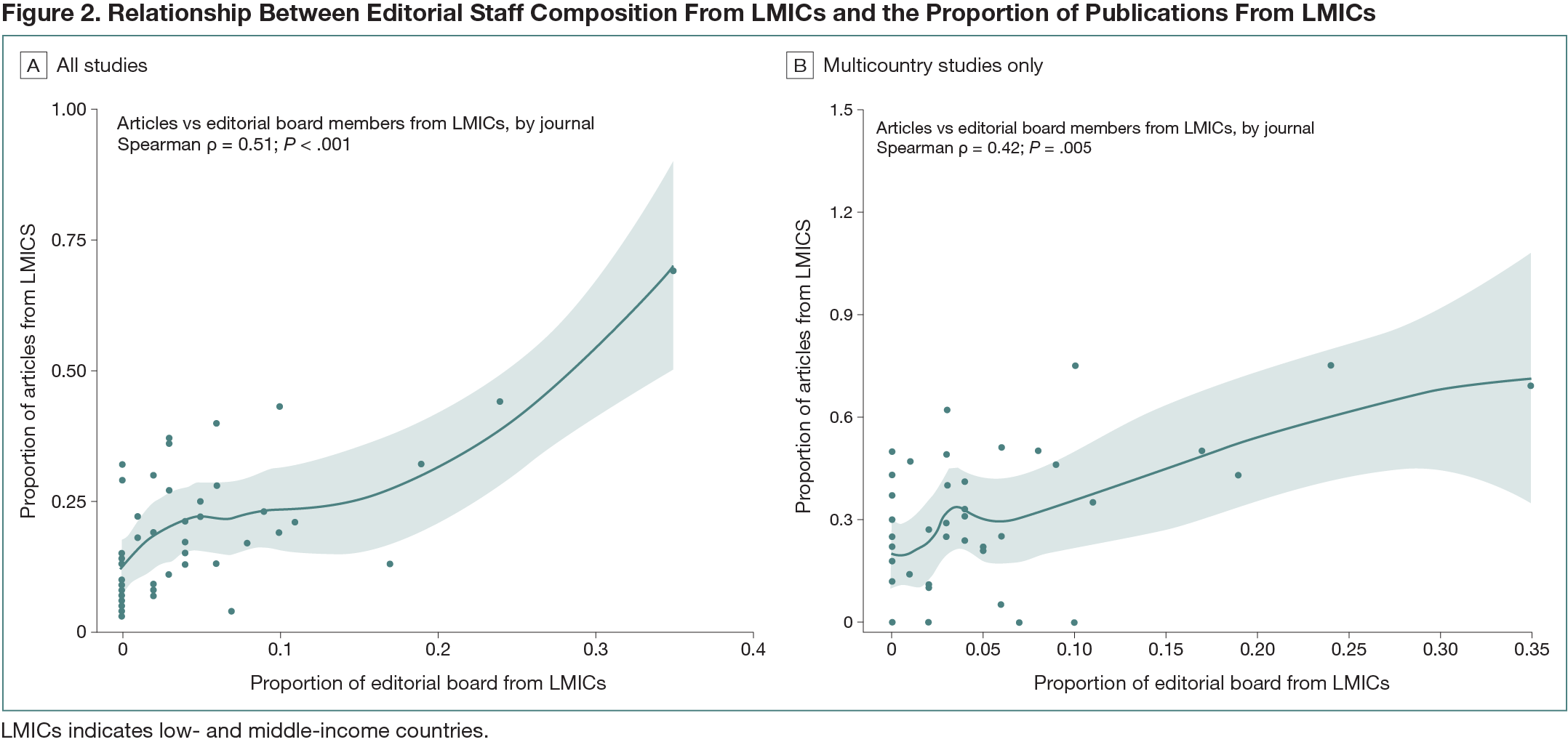 There were 3819 editorial staff in the 45 included journals: 3637 (95.2%) were affiliated with high-income countries, 140 (3.7%) with upper−middle income countries, 37 (1.0%) with lower−middle income countries, and 5 (0.1%) with low-income countries. Every editor in chief (n = 48; 100.0%) was affiliated with a high-income country. Of the 459 associate editors, 445 (96.9%) were affiliated with high-income countries, 10 (2.2%) with upper−middle income countries, 4 (0.9%) with lower−middle income countries, and 0 with low-income countries. Editorial staff were most commonly affiliated with North American (2120 [55.5%]) and European and Central Asian countries (1256 [32.9%]). Of the 10,096 original research articles included, 7857 (77.8%) reported research conducted in high-income countries, 1562 (15.5%) in upper−middle income countries, 507 (5.0%) in lower−middle income countries, and 170 (1.7%) in low-income countries. Greater editorial staff representation correlated moderately with more published articles reporting research conducted in low- and middle-income countries among all articles (Spearman ρ, 0.51; P < .001) and among articles reporting multicountry studies (Spearman ρ, 0.42; P = .005) (Figure 2).