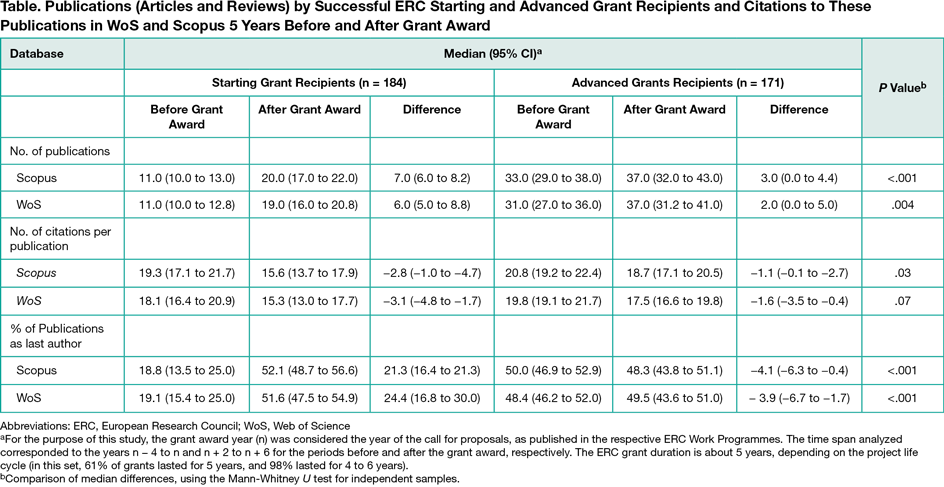 To analyze the association of European Research Council (ERC) funding with the bibliometric output of successful grantees.
