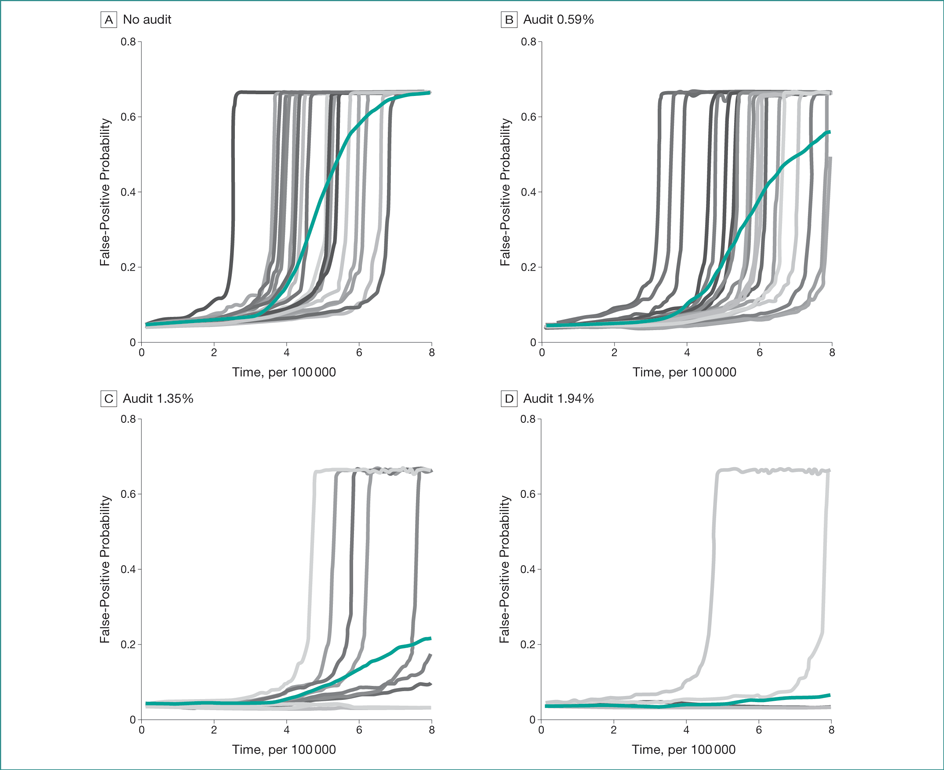 Without audits, effort declined, and the false-positive rate reached two-thirds in almost every simulation, meaning that most positive findings were wrong (Figure). Auditing 1.94% of all publications avoided the explosive increase in false positives in 95.0% of simulations. Audits decreased the volume of publications as laboratories worked longer on each question. Auditing 1.94% would cost an estimated $169 per publication in US dollars (95% CI, $152$171). Adding measurement error of ±20% did not affect the efficacy of the audits.