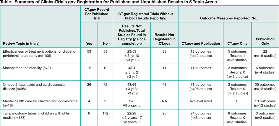 Across topic areas, only 24% (101 of 419) were registered in ClinicalTrials.gov and 38% (95 of 251) of studies did not have results published in peer-reviewed literature. The potential impact of this missing information on the conclusions of systematic reviews is unknown. When there were both ClinicalTrials.gov records and publications, 37% (74 of 198) of outcome measures did not match, raising a concern about bias owing to selective outcome reporting. It appears that prespecification of a primary outcome variable in ClinicalTrials.gov does not inhibit reporting other outcomes in publications. New rules requiring outcome measure specification and reporting should be considered. Journals and indexing tools could facilitate the inclusion of information from ClinicalTrials.gov into systematic review by adopting a more standardized format for listing the ClinicalTrials.gov identification number.