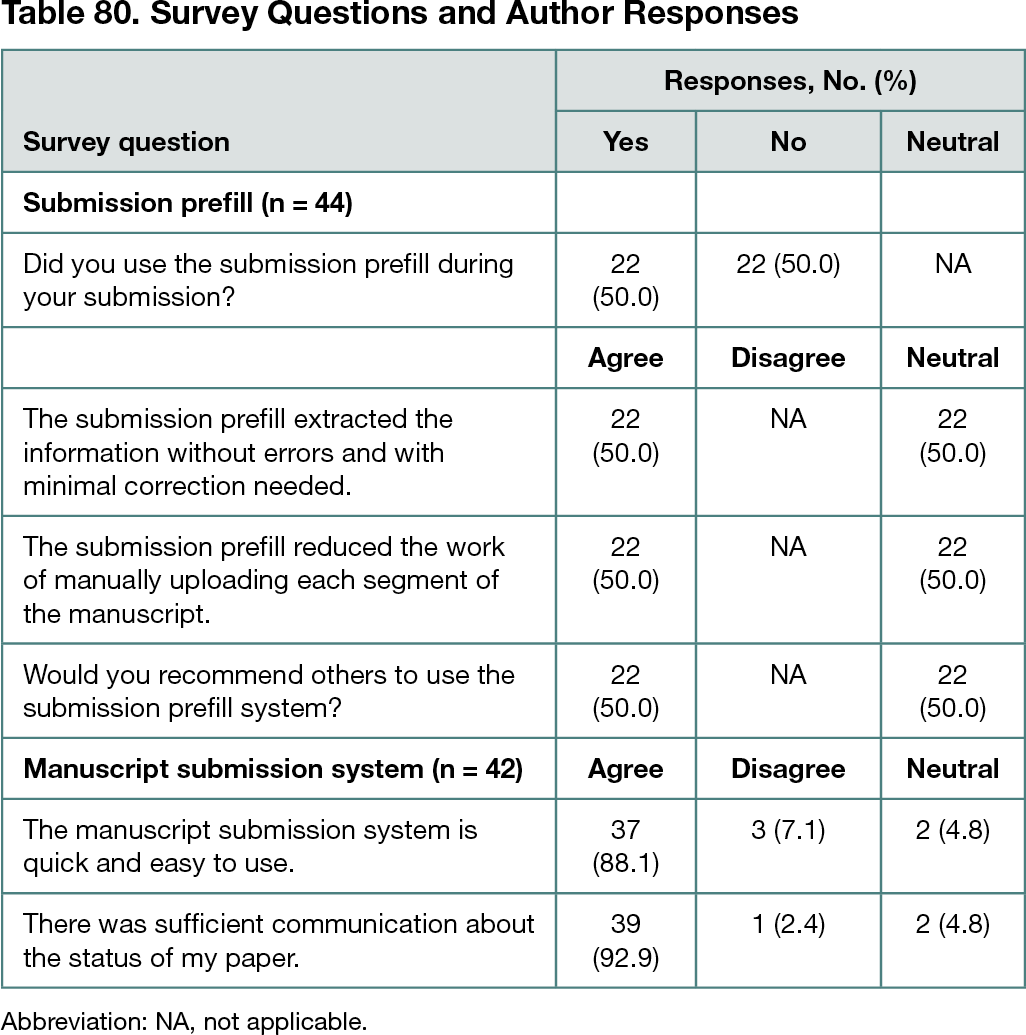 A total of 44 authors completed the survey on submission prefill, and 42 completed the survey on the manuscript submission system. Because the surveys were embedded as part of the submission processes, the response rate was 100%. Overall, the responses to the question of whether the submission prefill was effective in reducing the workload were divided evenly (50.0% agree vs 50.0% neutral), but there was overwhelmingly positive feedback on the effectiveness of manuscript submission system in terms of its ease of use (88.1%) and in obtaining the status of the manuscript (92.9%). The survey questions and their respective responses are as outlined in Table 80.