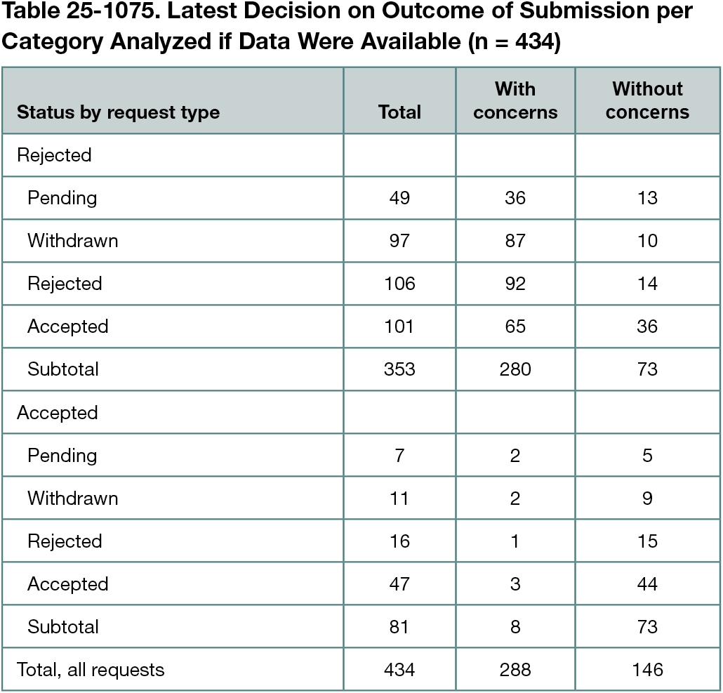 Of the 452 articles assessed, most requests for 3 or more authorship changes were denied; 367 (81.2%) were denied vs 85 (18.8%) approved. For the 170 articles for which the data were available, the median (range) number of authors was 4 (3-10). A total of 301 requests (66.6%) had concerns and 151 (33.41%) had no concerns. Of the denied requests for authors changes, 292 (79.6%) had concerns and 75 (20.44%) had no concerns. Of approved requests, 76 (89.41%) had no concerns and 9 (10.59%) had concerns. Denied requests were more likely to have concerns (OR, 32.9 [95% CI, 15.9-68.6]) compared with approved requests. The latest decisions per paper per category are shown in Table 25-1075.