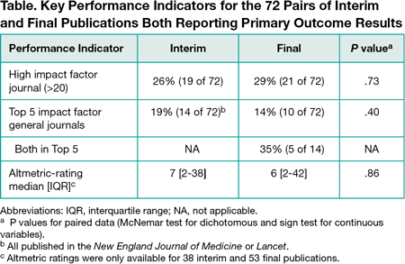 We conducted a PubMed search (2006-2015) for interim publications of randomized clinical trials, including the terms interim, not mature, or immature in the title or abstract. We used registration numbers and author names to search PubMed, ClinicalTrials.gov, and Web of Science through 2016 for final publications (authors were contacted if none identified) and determined each publication"s journal Impact Factor and Altmetric rating (ie, news and social media attention). Two researchers confirmed interim and final publication pairing and abstracted data.Results