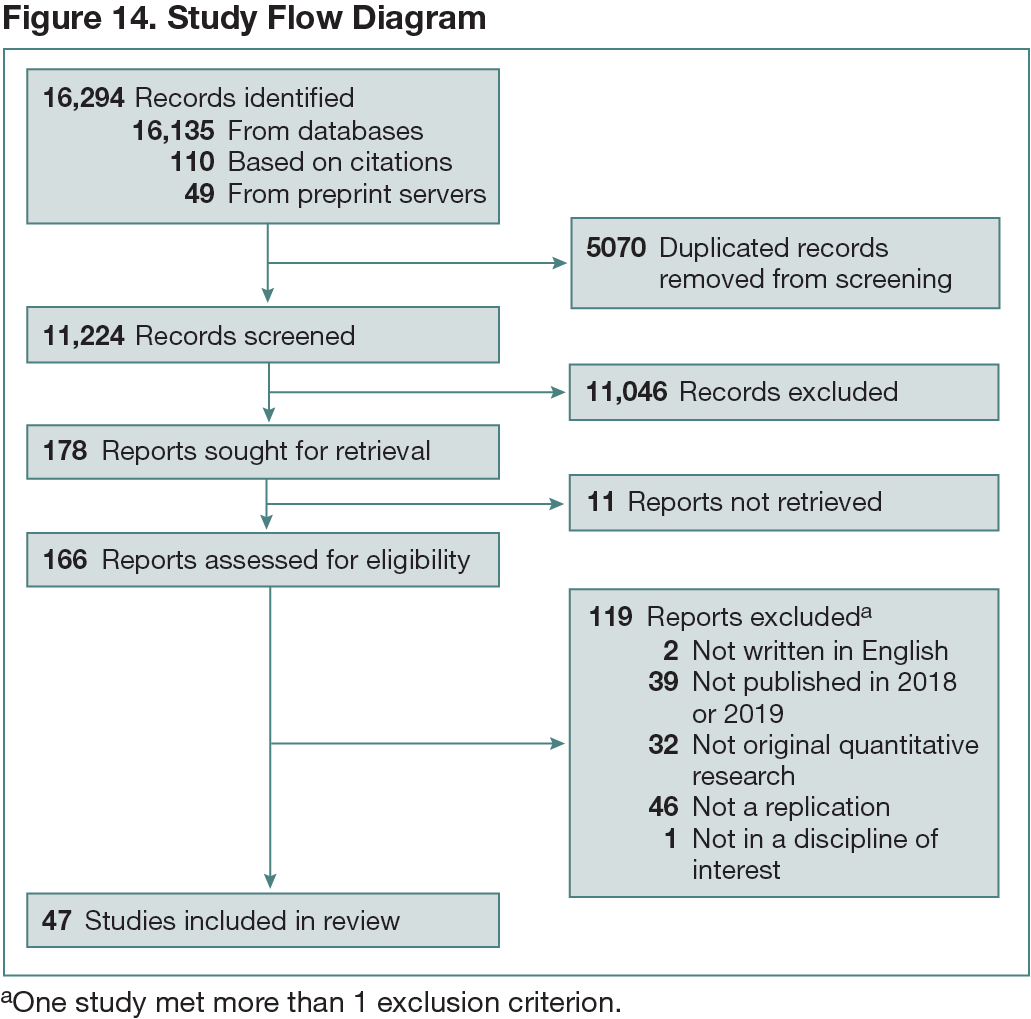 The search identified 11,224 unique documents, of which 47 were included (Figure 14). Most studies were related to either psychology (48.6%) or health sciences (23.7%). Among these 47 documents, 36 described a single replication study, while the remaining 11 reported at least 2 replications in the same paper. Less than half of the studies referred to a registered protocol. There was variability in the definitions of replication success, with studies related to psychology and health sciences tending to use a comparison of effect sizes to define replication success. Based on the definition used by the authors of each study, 95 of 177 studies (53.7%) achieved replication success.