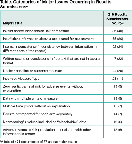 Among 358 initial results submissions in the 4 weeks between July 19, 2015 and August 15, 2015, 240 had major issues. In a convenience subsample of 215 submissions (114 [53%] nonindustry and 101 [47%] industry) we identified 471 occurrences of 37 unique major issue categories with a mean (SD) of 2.2 (1.3) unique major issues overall (1.9 [1.2] industry and 2.5 [1.4] non-industry). The top 12 major issue categories accounted for 398 (85%) occurrences of all major issues (Table). The top 5 unique major issues (occurring in ≥20%) in submissions had an invalid and/or inconsistent unit of measure (86 [40%]), insufficient information about a scale (55 [26%]), internal inconsistency (52 [24%]), written results or conclusions (47 [22%]), and unclear baseline or outcome measure (44 [20%]).