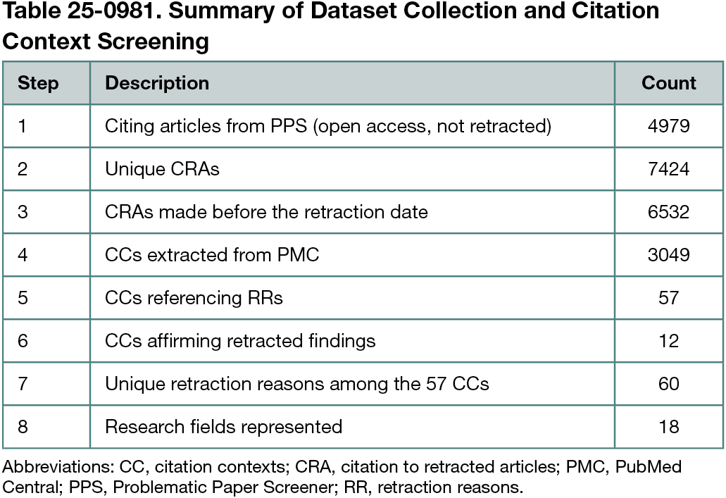 RRs were obtained from the Retraction Watch database1 for a set of 22,558 publications that cite retracted sources accessed from the Problematic Paper Screener.2 We selected 29 of 108 retraction reasons that directly relate to scientific content of the article (eg, unreliable or fabricated data or results). To ensure access to CCs, we limited our dataset to open access citing articles and excluded those that had themselves been retracted. This yielded 4979 citing articles and 7424 unique CRA instances; 88% of these were preretraction citations. We then limited the rest of the analysis to a subset of 3049 CCs from the PubMed Central Open Access corpus.3 We used regular expressions to search for terms referencing concepts related to the retraction reasons (eg, “data,” “results,” “findings”) and manually validated their use in the CCs.