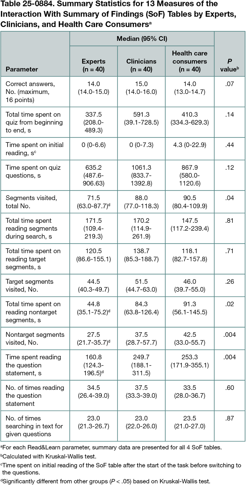 We collected the data from 40 experts, 40 clinicians, and 40 health care consumers (Table 25-0884). There were no significant differences between experts, clinicians, and health care consumers in terms of quiz performance, with all groups achieving a similar number of correct answers. Additionally, total time spent on the quiz, initial reading, and quiz questions did not differ between the groups. Significant differences were observed in their interaction with the SoF tables. Experts visited fewer numbers of table cells in total and fewer nontarget segments and spent the least amount of time reading the nontarget segments, compared with clinicians and health care consumers. They also spent the least amount of time reading the question statement.