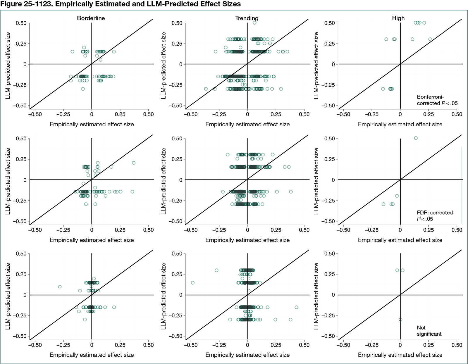 We computed 115,056 exposure-phenotype partial correlations among 560 chemical, dietary, and clinical exposures and 268 phenotypes in 80,000 US adults (1999-2018 NHANES).3 We then sampled 1500 pairs: 500 significant after Bonferroni correction, 500 significant only after false-discovery rate (FDR) correction, and 500 not significant—to fit within the LLM prompt window. An OpenAI-o1-aug24 model (temperature = 0) acting as a prompted “epidemiologist” was asked to predict the sign, magnitude, and P value of each pair and rated the evidence generated as high, trending, or borderline. Verifiability of LLM-cited references was assessed by estimating κ values and Spearman correlation.