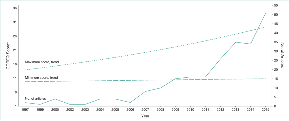 An electronic search was conducted in PubMed, Ovid MEDLINE, Web of Science, SCOPUS, and GoPubMed to identify English-language primary QPHR studies from India, published between January 1, 1997, and June 30, 2016. Study selection was based on title, abstract, and full-text reviews. To assess included articles, the following modifications were made to the Consolidated Criteria for Reporting Qualitative Research (COREQ) checklist: item 9 was subdivided into 3 subcategories (study design, methodological orientation, data collection method); item 33 was added (study limitations); and all original items were retained. All included articles were independently assessed for compliance with the COREQ checklist by 2 groups of 2 reviewers, and each item was noted as either reported or unreported. The summary included the number of COREQ items reported by each study and the number of studies that reported each COREQ item. Descriptive statistics for each year and for pre- and post-COREQ time periods were reported.