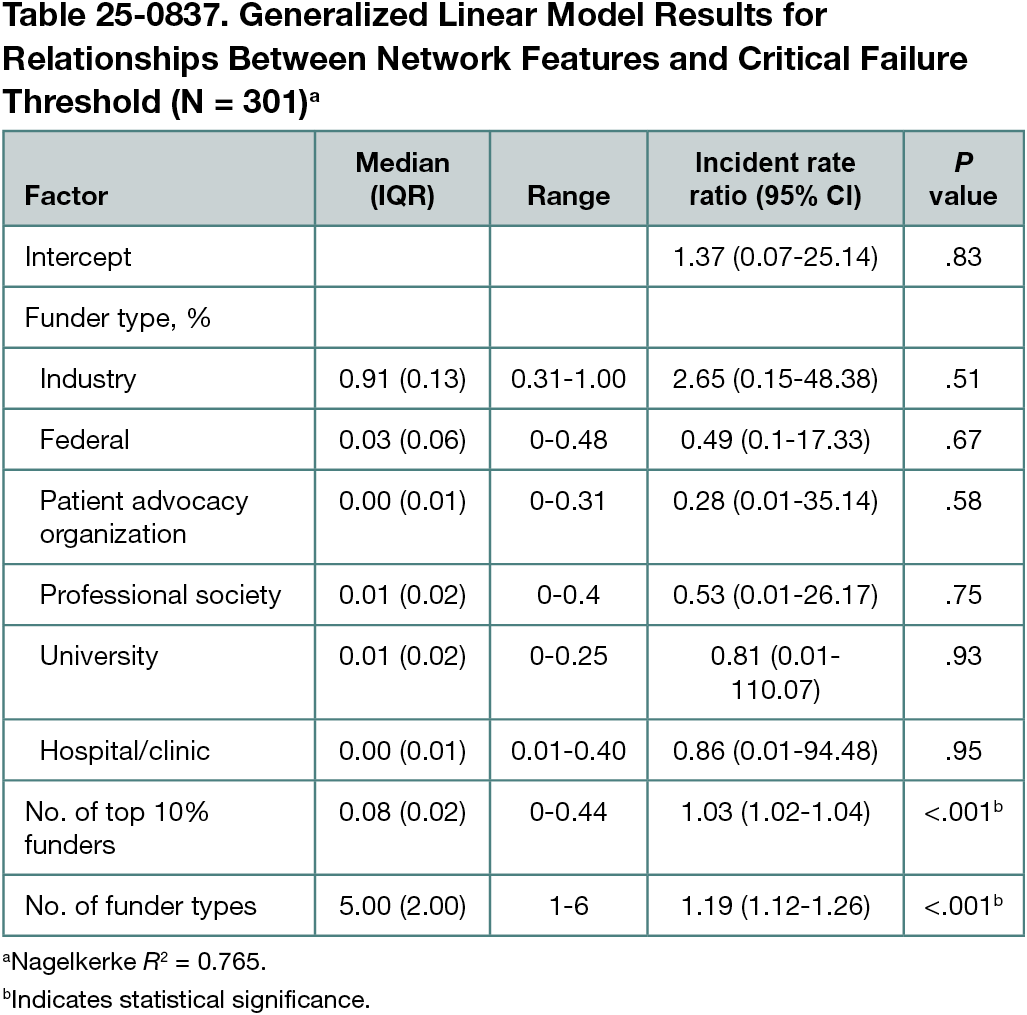 We identified 37,993 articles associated with the 302 drugs. The GPT 4.0 classifier achieved 98.9% accuracy compared with the human annotated sample. In the adverse events models, CFT returned adjusted incident rate ratios (IRRs) of 0.94 (95% CI, 0.91-0.97; P < .01) for total events, 0.94 (95% CI, 0.91-0.97, P < .01) for serious events, and 0.94 (95% CI, 0.91-0.98; P < .01) for fatal events. The number of funders per network was not a significant factor in any adverse events model. The network features model (Table 25-0837) returned significant relationships between the CFT and the number of funders in the top 10% by out-degree, a network science measure of the number of outgoing connections from a given node (IRR, 1.03 [95% CI, 1.02-1.04]; P < .001) and funder-type heterogeneity (IRR, 1.19 [95% CI, 1.12-1.26]; P < .001).