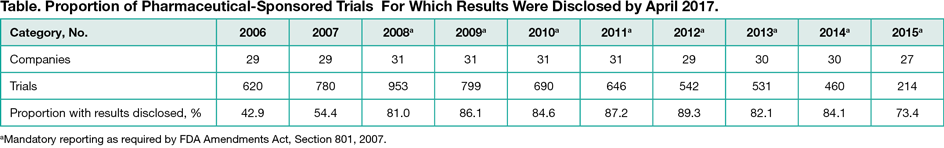 Among the top 50 companies, 31 (62.0%) met inclusion criteria and were represented in TrialsTracker: 25 (80.6%) were EFPIA/PhRMA members and 6 (19.4%) nonmembers (generally medical device, generic drug, and non-EU/US companies). Among 6235 trials registered and completed by these companies between 2006 and 2015, results were disclosed for 4761 (76.4%), with the proportion rising from 42.9% in 2006 to approximately 80.0% from 2008 onwards (Table). The proportion of trials with results disclosed was similar for those sponsored by PhRMA/EFPIA members (1361 of 5697 [76.1%]) and nonmembers (113 of 538 [79.0%]). Of all clinical trials identified in TrialsTracker, results were disclosed for 74.0% of all pharmaceutical-industry sponsors and 45.7% of non-industry sponsors.