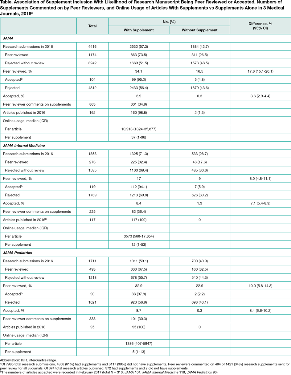 Cohort study that assessed the numbers and types of supplements submitted with research manuscripts to the 3 medical journals (1 general and 2 specialty) in The JAMA Network with the highest volume of research submissions in 2016: JAMA (n=4416), JAMA Internal Medicine (JIM) (n=1858), and JAMA Pediatrics (JPED) (n=1711). We compared rates of rejection without review vs peer review and acceptance vs rejection for papers with supplements vs papers without supplements and analyzed the peer reviewer comments for the supplements. In addition, we evaluated all research articles published in these 3 journals in 2016 (n=374) and the numbers and types of supplements published. For all articles published with supplements, we compared online usage (views and downloads) of articles vs the supplements for a defined period, January 2016-March 2017. For analysis of research submissions, we calculated risk differences with 95% CIs as well as2-sided P values by χ² test.