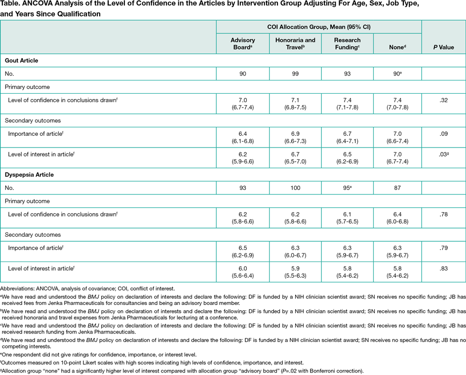 We invited UK physicians in the British Medical Association membership database, by email, to participate in a research project in January 2016. One-third were general practitioners, one-third junior physicians, and one-third consultants. Volunteers were blinded and randomized to receive a shortened version of 1 of 2 clinical reviews (on gout or dyspepsia) previously published by The BMJ and considered to be of interest to a wide clinical audience. Each review was assigned 1 of 4 possible COI statements, and each review was identical except for permutations of the COI statement. After reading the review, participants completed an online questionnaire rating their confidence in the article’s conclusions (primary outcome), its importance, their level of interest in the article, and their likeliness to change practice after reading it. Blinded factorial analyses of variance and analyses of covariance were carried out to assess the influence of each review and type of COI on outcomes.