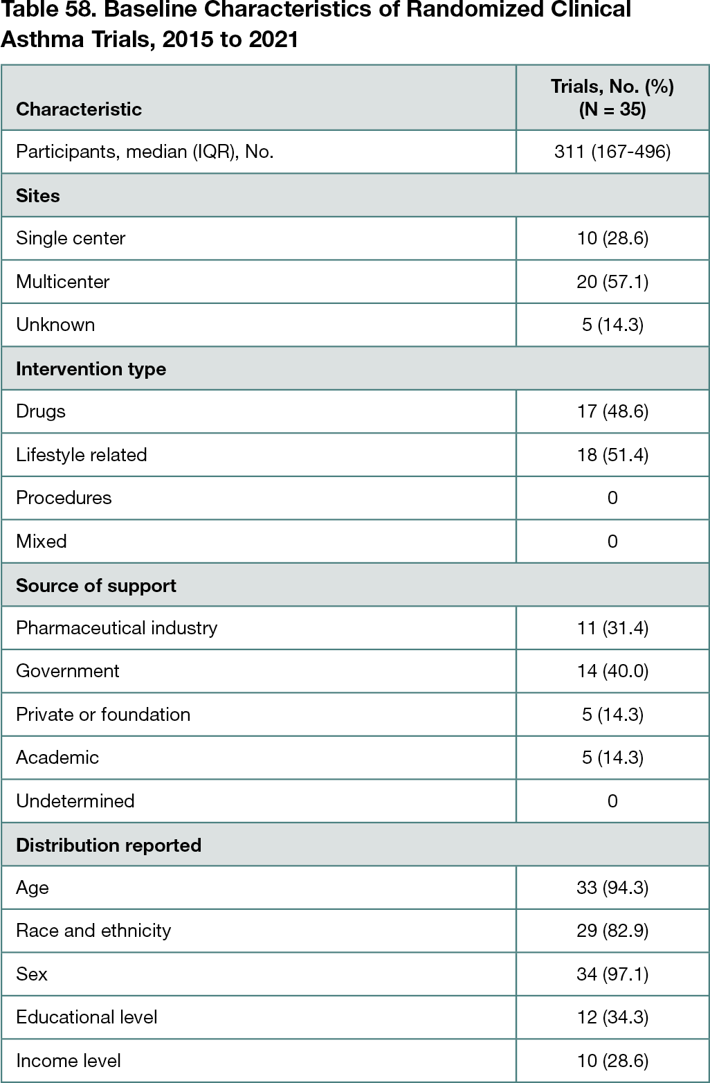 Of the 1032 trials screened, 35 met inclusion criteria (with the majority excluded due to international enrollment). The trials included a median of 311 participants (IQR, 167-496 participants). Approximately half of the trials were drug intervention trials, and the remainder investigated educational or behavioral interventions. There was a mix of funding sources, including pharmaceutical, government, academic, and private institutions. Almost all of the trials reported age and sex distribution of the participants. A total of 29 trials (82.9%) reported race or ethnicity. Only 12 (34.3%) and 10 (28.6%) trials reported educational and income levels, respectively (Table 58). With respect to representativeness of the study populations, among trials reporting participant sex, 1 of 33 (3.0%) had a proportion of females that was overrepresentative of the US population with asthma and no trials were underrepresentative. Among trials reporting Black race, 5 of 25 (20.0%) enrolled a proportion of Black participants that was overrepresentative of the US population with asthma and no trials were underrepresentative. Among trials reporting Hispanic ethnicity, 1 of 16 (6.25%) was overrepresentative and no trials were underrepresentative. Among trials reporting White race, 4 of 27 (14.8%) enrolled proportions that were underrepresentative of the US population with asthma and no trials were overrepresentative.