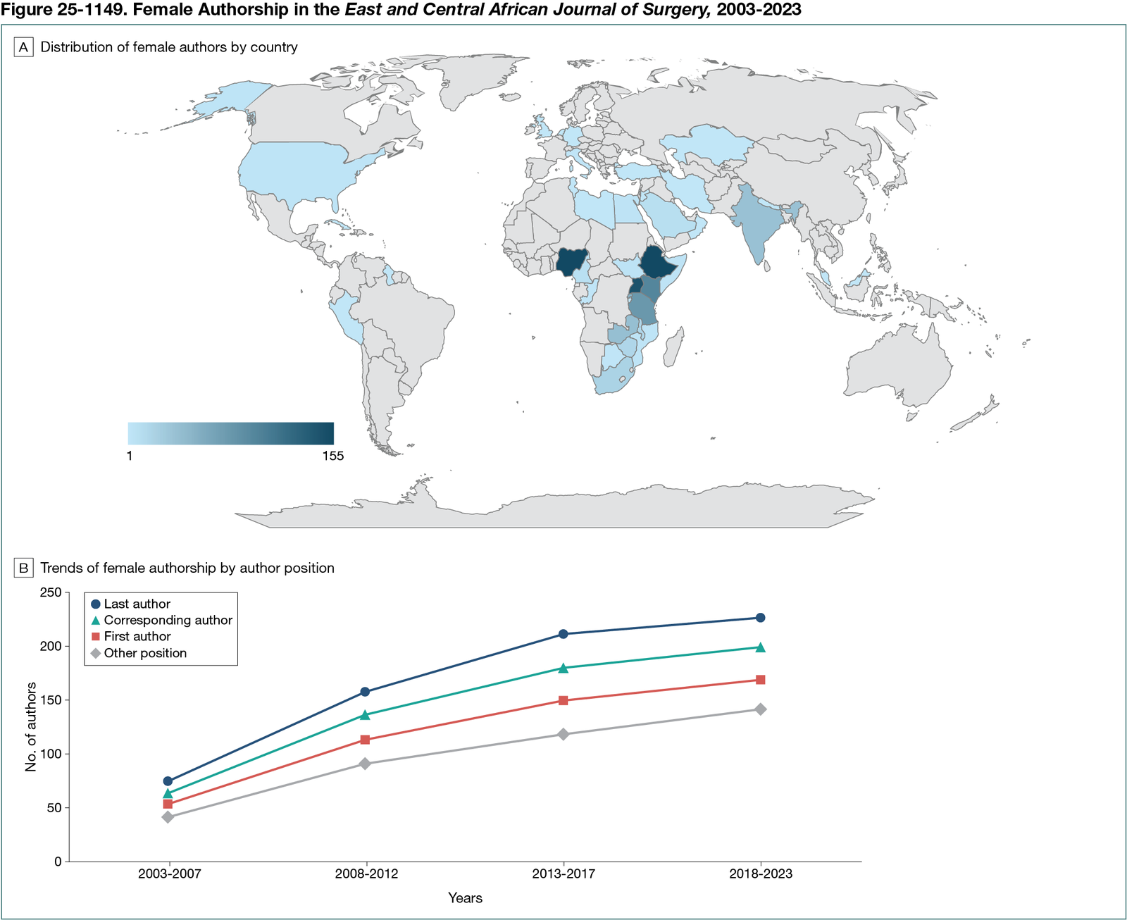 A total of 889 articles were included featuring 3001 authors; 2609 (86.9%) were male and 392 (13.1%) were female. In total, 92 females (3.1%) were designated as first authors, 93 (3.1%) as corresponding authors, and 90 (3.0%) as last authors. There was a predominance of males in the positions of first, last, and corresponding author. Despite this, the number of females represented in these categories had a steady increase over the years. The gender disparity ratio increased in the first 15 years, then dropped in the last 5 years. There were 2523 African authors (84.1%), with Ethiopia having the largest number of authors (155 [5.2%]). The distribution according to country and the trends in female authorship are presented in Figure 25-1149.