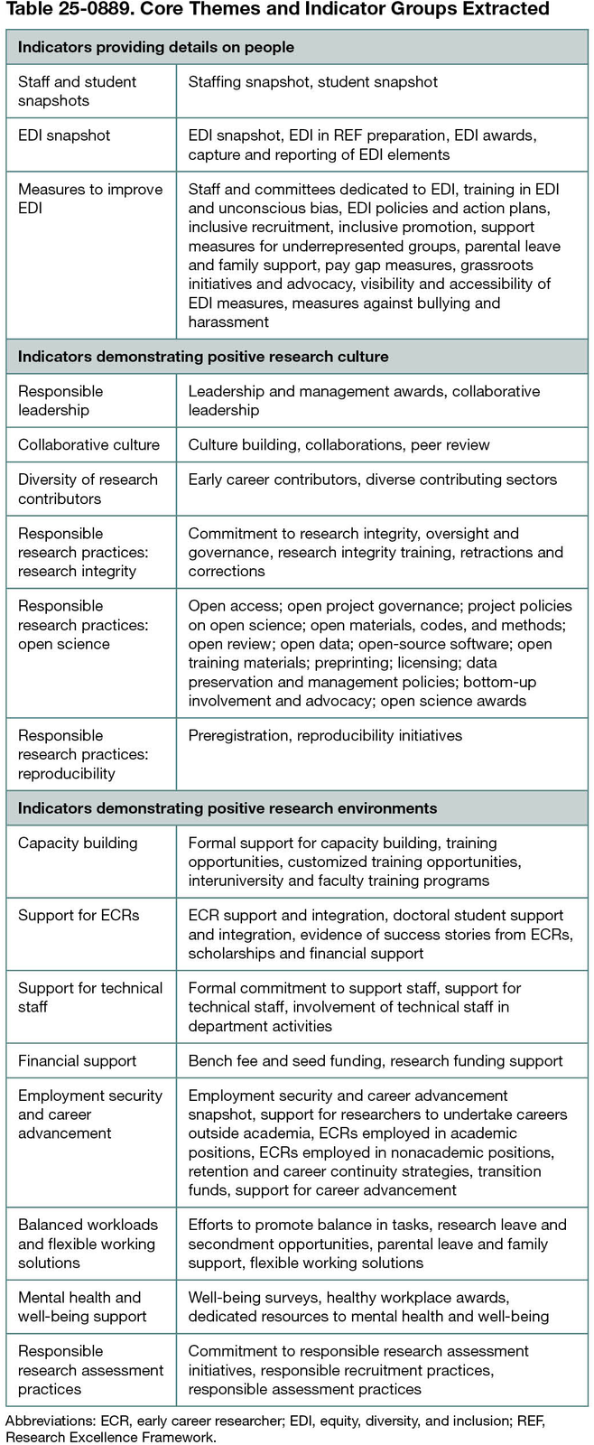 The analysis identified a vast array of elements, which were used to showcase positive research environments. We organized the elements extracted in indicators providing details on people, such as diversity metrics, staff and student characteristics, and measures to improve equity, diversity, and inclusion; indicators demonstrating positive research cultures, such as responsible leadership, collaborative culture, research integrity, and open research; and indicators demonstrating positive research environments, such as capacity-building measures, staff and financial support, employment security and progression, and responsible assessment practices (Table 25-0889). The breadth of indicators identified showcased differences and similarities in how different institutions and units of assessment qualified their research environments.