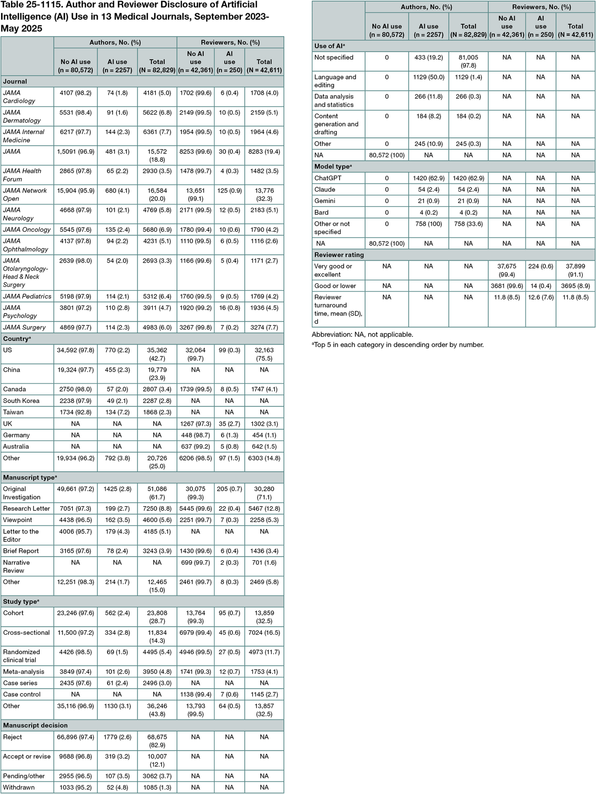 Of 82,829 manuscripts submitted during the study period, 2257 (2.7%) declared AI use. Authors’ use of AI increased from 1.6% in September 2023 to 4.2% in May 2025 (r2 = .34; P < .01). Table 25-1115 contrasts manuscripts with or without disclosed AI use by author country, journal, manuscript type, study type, editorial decision, AI use categories, and common AI models used. Author AI use was highest in JAMA Network Open (4.1%) and JAMA (3.1%) and lowest in JAMA Dermatology (1.6%) and was highest among authors from Taiwan (7.2%). Letters to the Editor (odds ratio [OR] 1.63, 95% CI 1.37-1.94) and Viewpoints (OR 1.44, 95% CI 1.21-1.72) were more likely to involve AI use than Original Investigations. The most common reported reasons for AI use by authors were for language and editing (50.0%), data analysis and statistics (11.8%), and content generation and drafting (8.2%). ChatGPT was the most common AI model used by authors (62.9%). Mean (SD) reviewer turnaround times were 11.8 (8.5) days for those who did not disclose AI use and 12.6 (7.6) days for reviewers who disclosed AI use. Reviewer use of AI was highest for JAMA Network Open (0.9%) and JAMA Psychiatry (0.8%) and among reviewers from the UK (2.7%).