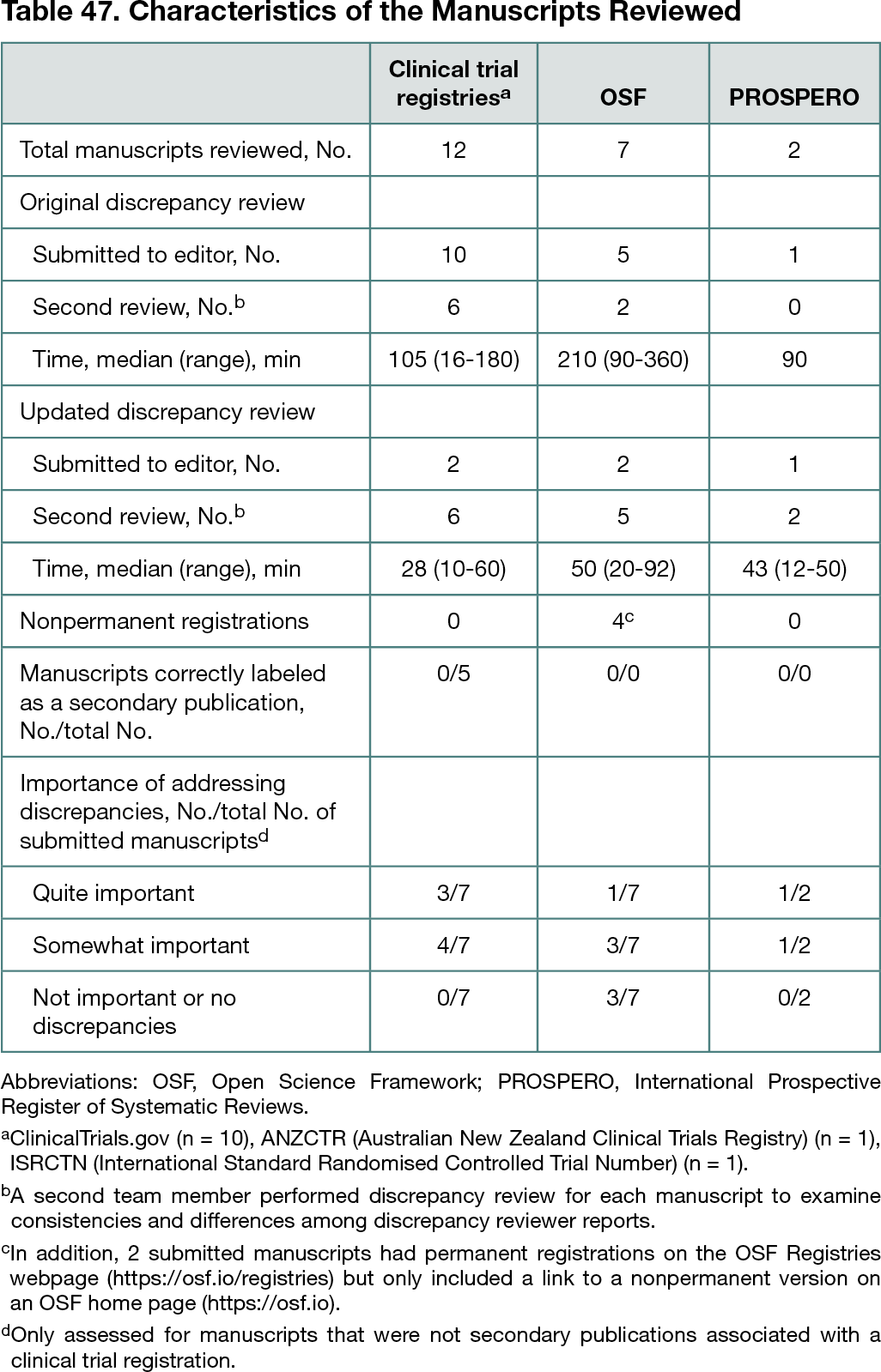 Of the 18 invited journals, 5 agreed to participate, 2 of which did not receive any manuscripts reporting a registration during the study period and 1 of which had difficulty adding discrepancy review to their manuscript handling procedures and therefore did not provide any manuscripts to review, leaving 2 participating journals. Discrepancy review was performed between January 29 and May 18, 2021, on all registered studies submitted to Nicotine and Tobacco Research (n = 18) and on all registered studies for which the editor in chief of European Journal of Personality acted as action editor (n = 3). Table 47 details the reviewed manuscripts and findings. Registrations were generally too imprecise to be effectively evaluated by the original discrepancy review process, which used a detailed and structured checklist. Thus, the authors developed an updated discrepancy review process that used a semi-structured format with 8 guiding questions regarding exploratory studies, proper registration, retrospective registration, hypotheses, independent variables, outcome measures, analyses, and additional discrepancies. Discrepancy reviewers provided 59 comments on the 12 manuscripts that were accepted for publication. Authors fully addressed 31, partially addressed 10, and did not address 18. Optional questionnaires were completed by 5 of 13 action editors and 4 of 21 manuscript authors who showed no opposition to discrepancy review.