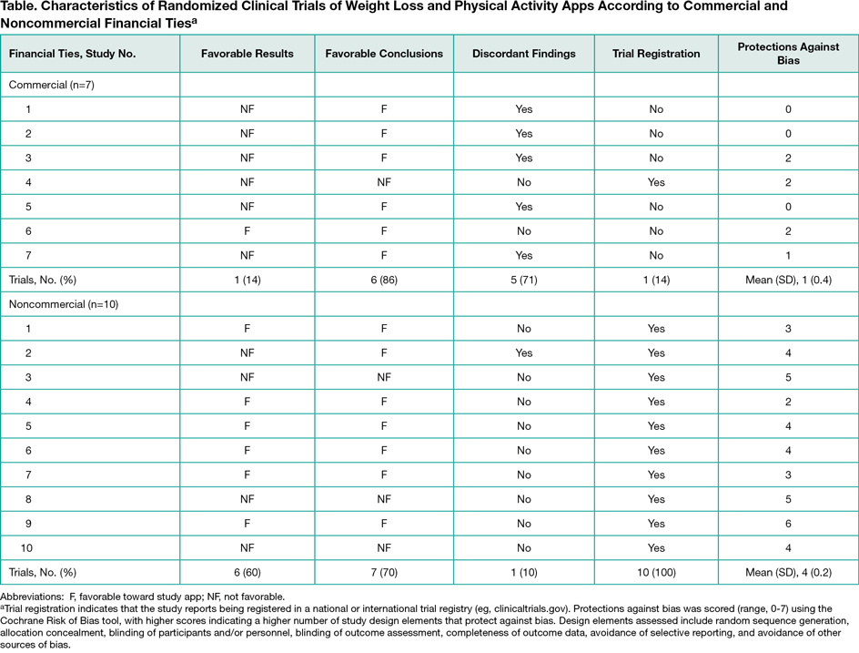 Some of the most highly marketed mobile applications (“apps”) focus on weight loss and physical activity. The US Food and Drug Administration has declined to regulate them. It is unknown whether app research studies that receive financial support from commercial entities are similar to studies without commercial support in the degree to which they protect against bias. We sought to determine whether app studies with commercial financial ties were more or less likely than others to have discordant results and conclusions or other characteristics pertinent to assessing bias.