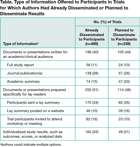 Surveys were sent to authors of 19,824 trials; 3227 responses were received (16%). Of the 3227 trials, 2690 had human participants and 1818 enrolled individual patients. Among the 1818, 906 authors (50%) had asked patients if they wanted to receive results, 305 (17%) had involved or planned to involve patients in developing dissemination materials, and 295 (16%) had involved or planned to involve patients in identifying appropriate dissemination methods. Four hundred ninety-eight (27%) reported that they had already disseminated results to participants and another 238 (13%) planned to do so, 600 (33%) did not plan to, 176 (10%) were unsure, and 256 (14%) responded with “other” or did not answer. Of the 498 authors who disseminated results to participants, 198 (40%) shared academic reports, 252 (51%) shared lay reports, and 164 (33%) provided individualized study results (Table). Among the 1818 trials, 577 authors (32%) shared or planned to share results with patients outside their trial by direct contact with charities/patient groups, 401 (22%) via informal patient communities, 845 (46%) via presentations at conferences with patient representation, 494 (27%) via mainstream media, and 708 (39%) by publishing lay summaries online. Relatively few authors of the 1818 trials reported that dissemination to participants and other patient groups was suggested to them by institutional bodies: by research funders (314 [17%] suggested dissemination to trial participants and 252 [14%] suggested dissemination to other patient groups), and by ethical review boards (333 [18%] suggested dissemination to trial participants and 148 [8%] suggested dissemination to other patient groups). Author-reported barriers to dissemination included not having access to patient contact information, insufficient funding and support, inaccessible patient groups (eg, deceased, vulnerable, or mobile), time interval between the study and publication, and lack of patient-centered dissemination training.