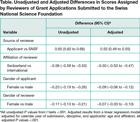 Between 2009 and 2015, 36,993 reviewers assessed 12,132 applications for the SNSF. The mean (SD) score of reviewers proposed by applicants (n=8308) was 5.12 (1.01) vs 4.47 (1.25) for reviewers proposed by the SNSF (n=26,594). Mean (SD) scores were 4.19 (1.27) for Swiss experts (n=8399) vs 4.76 (1.19) for international experts (n=26,503); 4.44 (1.25) for female (n=7121) vs 4.67 (1.22) for male (n= 27,781) principle applicants; and 4.48 (1.26) for reviews from female (n=6933) vs 4.66 (1.22) from male (n=27,969) reviewers. In adjusted analyses, the gender differences were attenuated, whereas the other differences changed little (Table). All differences were statistically significant.