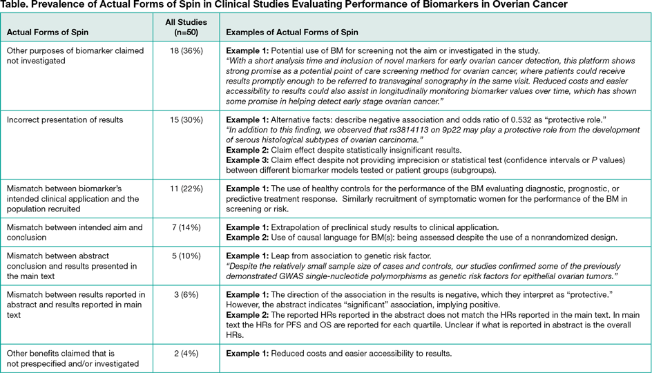 The objective of this systematic review was to document and classify spin or overinterpretation, as well as facilitators of spin, in recent clinical studies evaluating performance of biomarkers in ovarian cancer.