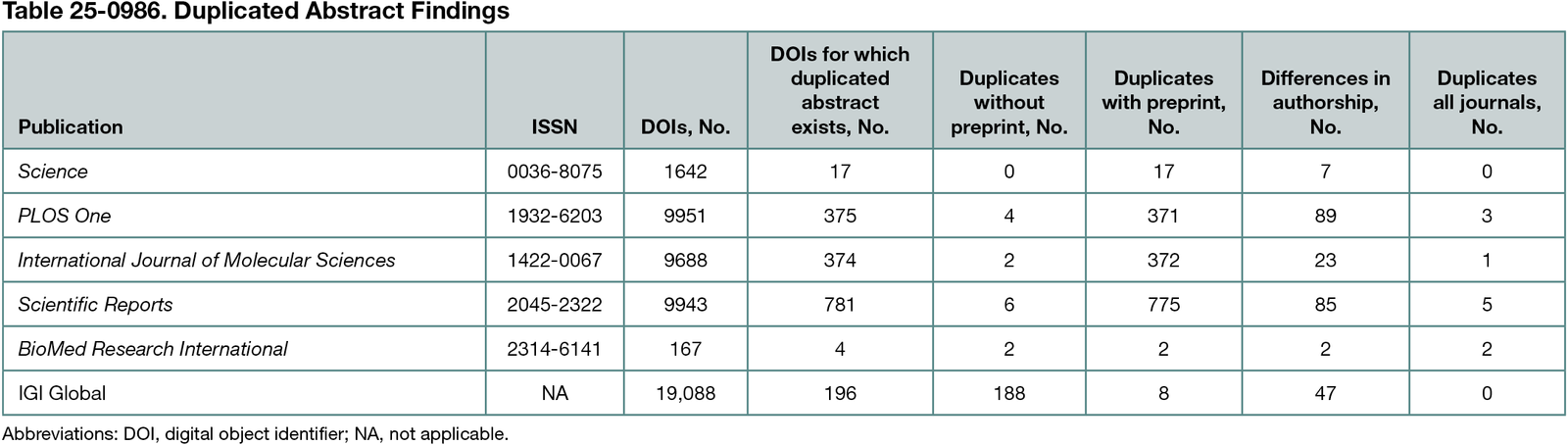 The vast majority of duplicates found were not problematic, as they typically originated from preprint versions (Table 25-0986). For example, of 375 duplicated abstracts for articles published in PLOS One, 4 were not preprint publications. Moreover, close inspection revealed that 3 duplicates were republication of abstracts only. Only the 1 remaining abstract could be seen as problematic, as it was a duplication of the same exact content in 2 different journals, both open access.