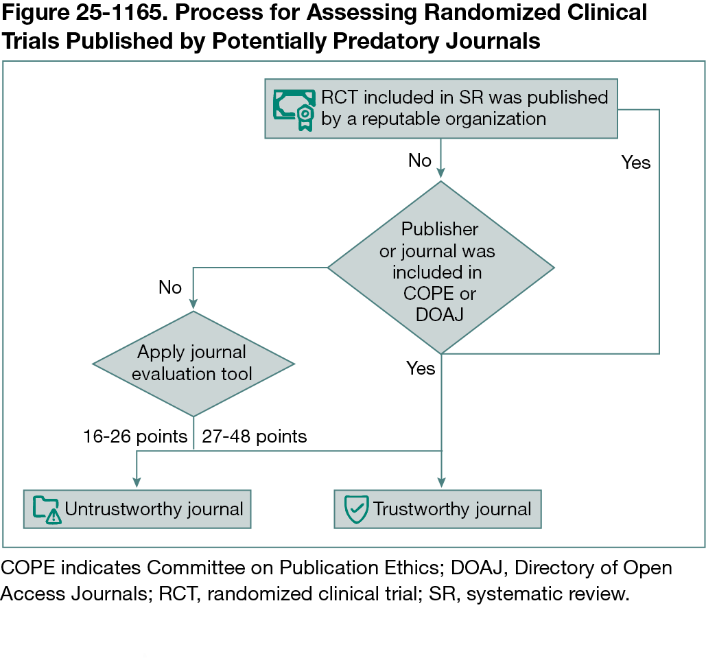 We conducted a cross-sectional study in which we included SRs with MAs published between 2021 and 2022 in the top 10 high-ranked anesthesia journals based on the Web of Science’s Journal Citation Report for 2021. Exclusion criteria included SRs without MAs or network MAs as well as those including observational studies and nonhuman studies. To determine whether an RCT was published in a potentially predatory journal, 2 authors independently followed a stepwise process: (1) an initial assessment of the publisher’s reputation, confirming if it was widely recognized and reputable in the academic publishing community; (2) verification of the journal’s indexing in the Committee on Publication Ethics or Directory of Open Access Journals; and (3) application of the Loyola Marymount University Journal Evaluation Tool (JET).3 Discrepancies between the 2 authors were resolved by consensus. The JET evaluates journals based on key criteria such as transparency of editorial processes, rigor of peer review practices, adherence to ethical standards, presence in reputable indexing databases, archiving practices, and the quality of the journal’s website; each aspect is scored using defined indicators based on their credibility and risk of predatory practices (Figure 25-1165). We summarized our results using descriptive statistics.