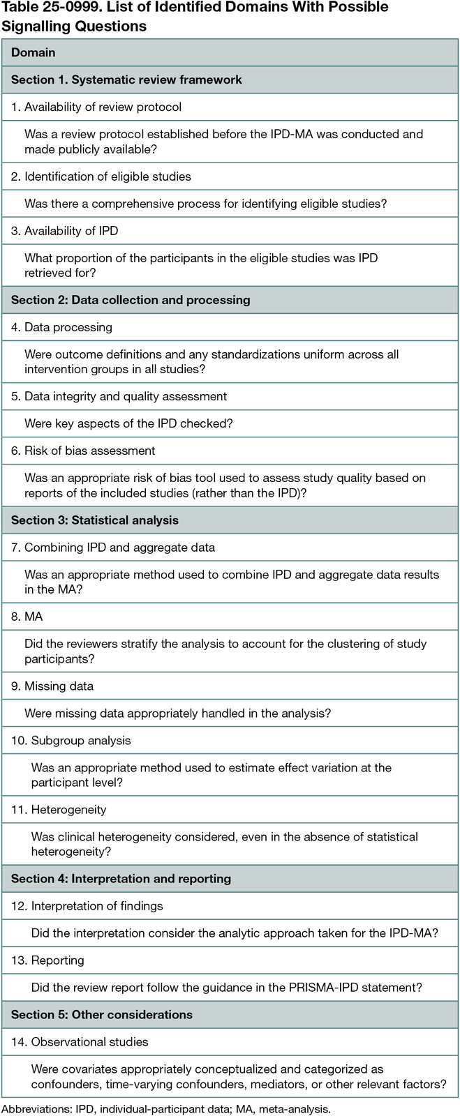 Individual-participant data meta-analysis (IPD-MA) is regarded as the criterion standard in evidence synthesis, but it is resource intensive. While there is consensus on reporting items, a consensus-based tool for the critical appraisal of the methodological quality of IPD-MA does not currently exist. We undertook a systematic methodology review as the initial phase in the development of a critical appraisal checklist. This review collated and summarized the available methodological guidance on IPD-MA of randomized and observational studies.