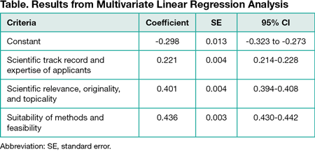 The mean score for the overall assessment was 4.46. Among the 3 criteria, the track record of the applicants received the highest average score (4.82), followed by scientific relevance (4.58) and the suitability of methods and feasibility (4.27). The linear multivariate regression analysis showed that the overall assessment was influenced most by the suitability of the methods and feasibility (b, 0.436; 95% CI, 0.430-0.442), followed by scientific relevance (b,0.401; 95% CI, 0.394-0.408) and the applicants’ track record (b, 0.221; 95% CI, 0.214-0.228) (Table). There were interesting differences between fields of research (humanities and social sciences, mathematics, natural and engineering sciences, and biology and medicine); the suitability of the methods and feasibility was more important in biology and medicine, whereas the track record received more weight in mathematics and natural and engineering sciences.