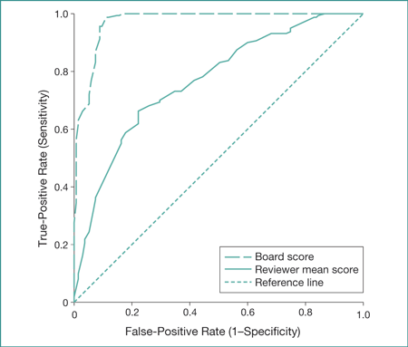 The area under curve for the Board score is 0.97 (95% CI, 0.95-0.99); Reviewer mean score, 0.77 (95% CI, 0.71-0.82).