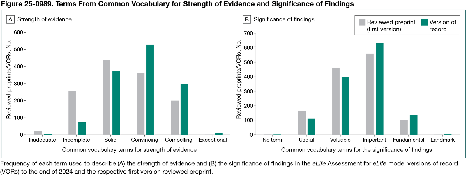 Panel A in Figure 25-0989 shows the terms used to describe the strength of evidence in VORs and the first version of the reviewed preprints. The evidence term improved between versions in 39.4% of cases (n = 509) and remained the same in 57.7% of VORs (n = 745). Of VORs in which the evidence was described as incomplete in the first reviewed preprint, 76.5% (n = 199) improved to solid or better, and in papers originally described as solid, 49.3% improved to convincing or better (n = 217). In papers in which the evidence was originally described as inadequate (n = 23), this improved in 78.3% of instances (n = 18) and approximately one-half ended as solid or better (47.8%, n = 11). The majority of VORs (82.6%, n = 1066) were declared after 1 round of revision and 13.5% (n = 174) after 2 or more rounds. Of the 4.0% of VORs declared without revisions (n = 51), only 13.7% had an evidence term of inadequate (n = 0) or incomplete (n = 7). The significance of the findings (Figure 25-0989, B) was most frequently described using valuable (VOR: 31.1%, n = 401) or important (VOR: 49.0%, n = 633); overall, significance terms remained the same in 78.2% of cases (n = 1010).