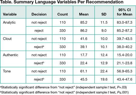 The Table summarizes key differences in language strategies used in peer reviewer reports that recommend acceptance or rejection of the manuscript being reviewed. There was no difference in reviewer reports recommending rejection vs acceptance in their analytic nature. Reviewer reports recommending rejection were significantly more ”authentic” (ie, had more frequent use of terms that indicate honesty and personal disclosure) and scored lower in terms of ”tone” (ie, emotional tone, where low scores indicate regret or hostility). Reviewer reports recommending rejection also scored lower in terms of “clout” (for which, high scores suggest that a review emerges from a perspective of high expertise and confidence on the part of the reviewer, and low scores reflect a more tentative or humble language style).