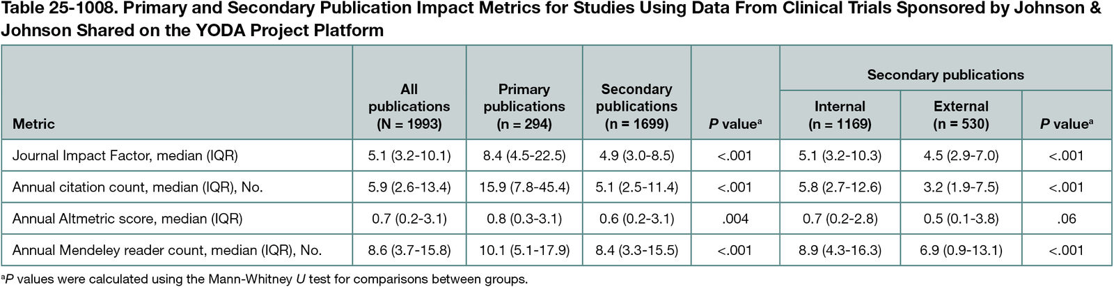 There were 294 trials with a primary publication sharing data on the YODA Project platform, 218 (74.1%) of which had at least 1 secondary publication, totaling 1699 secondary publications. Most were pooled analyses (1302 [76.6%]), as opposed to secondary analyses (397 [22.4%]). Trials of heart and blood disease interventions had the highest number of secondary publications per trial (median [IQR], 10.5 [2-19] publications). Compared with primary publications, secondary publications were published in journals with lower median (IQR) journal Impact Factors (8.4 [4.5-22.5] vs 4.9 [3.0-8.5]) and had lower annual citation counts (15.9 [7.8-45.4] vs 5.1 [2.5-11.4]), Altmetric scores (0.8 [0.3-3.1] vs 0.6 [0.2-3.1]), and Mendeley reader counts (10.1 [5.1-17.9] vs 8.4 [3.3-15.5]) (Table 25-1008). Secondary publications were predominantly internal (1169 [68.8%]), which, when compared with external secondary publications, were published in journals with higher median (IQR) Impact Factors (5.1 [3.2-10.3] vs 4.5 [2.9-7.0]) and had higher annual citation counts (5.8 [2.7-12.6] vs 3.2 [1.9-7.5]), Altmetric scores (0.7 [0.2-2.8] vs 0.5 [0.1-3.8]), and Mendeley reader counts (8.9 [4.3-16.3] vs 6.9 [0.9-13.1]).