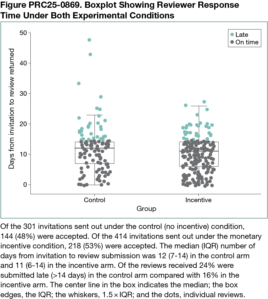 During the study, 131 manuscripts went out for review, with a median (IQR) of 5 (2-8) reviewer invitations per manuscript. Of 715 reviewer invitations, 414 (58%) included an incentive offer. There was no difference in the proportion of invitations that were accepted (control vs incentive, 144 of 301 [48%] vs 218 of 414 [53%]; P = .20), but a difference was seen in the primary outcome, with reviewers in the intervention group having a greater odds of completing the review compared with those in the control group (control vs incentive, 127 of 301 [42%] vs 206 of 414 [50%]; odds ratio, 1.36; 95% CI. 1.01-1.84). A Cox proportional hazards model showed that incentivized invitations were fulfilled slightly faster (median [IQR] time, 11 [6-14] days vs 12 [7-14] days; hazard ratio, 1.30; 95% CI, 1.04-1.62). There was no difference in the quality of reviewer reports, as adjudicated by the handling editors (control vs incentive, median [IQR] score on a 100-point scale, 75 [70-85] vs 75 [66-90]).