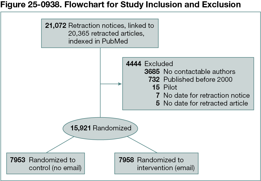 This was a parallel-group, 2-group, superiority trial. We identified and randomized retracted articles in PubMed published since 2000. The study was unblinded, but primary outcome ascertainment was objective, and randomization and allocation were fully and simultaneously computer automated. Authors with publicly available contact information were notified about citations of retracted articles in the intervention group; no notifications were sent about articles in the control group. The email included a voluntary survey question on knowledge of the retractions and invited additional voluntary feedback. Retraction, contact, and citation data were obtained from PubMed and Scopus. Follow-up started 3 months after the final intervention email was sent to allow in-press manuscripts that could not be affected by our intervention a chance to publish. The primary outcome was the difference in the rate of new citations of retracted articles between groups. We used a negative binomial model adjusted for years since retracted article publication, and our stratification variable, with outliers removed. Data analysis was performed in Stata version 16. We also report the results of a survey question on knowledge of retracted citations, and a sentiment analysis on email feedback. Additional methods details, including power calculations, are available in our prespecified protocol3 and at retracted.net.