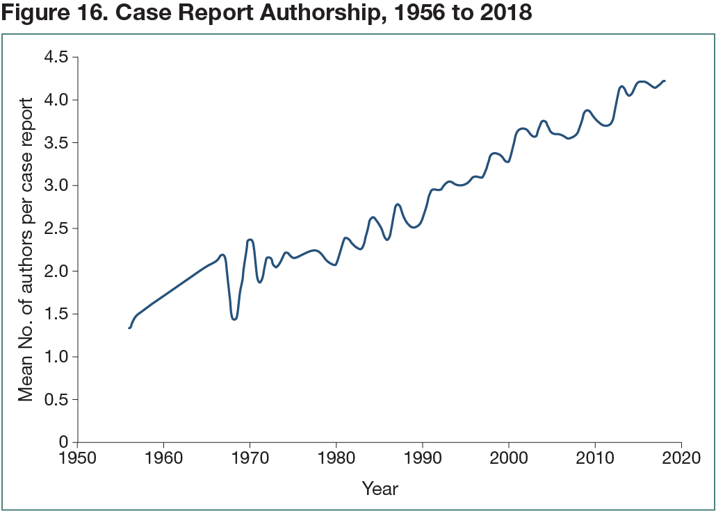A total of 13,960 case reports published in 14 plastic surgery journals between 1956 and 2018 were analyzed. The number of case reports published reached its peak in 2009, and this number has been decreasing since 2010. The overall percentage of case reports among all manuscripts published was 22%, ranging from 3% (in JAMA Facial Plastic Surgery) to 48% (in Ophthalmic Plastic and Reconstructive Surgery). The mean (SD) number of authors was 3.4 (1.7). The mean number of authors per manuscript increased from 1.3 in 1956 to 2.6 in 1990 and 4.2 in 2018 (Figure 16). The most common number of authors was 3 (found in 25% of case reports), followed by 2 (21%). Overall, 87% of the case reports had between 1 and 5 authors, whereas only 0.2% had 11 or more authors. One case report had 20 authors and another one had 19 authors, whereas no case report with 16 to 18 authors was found.
