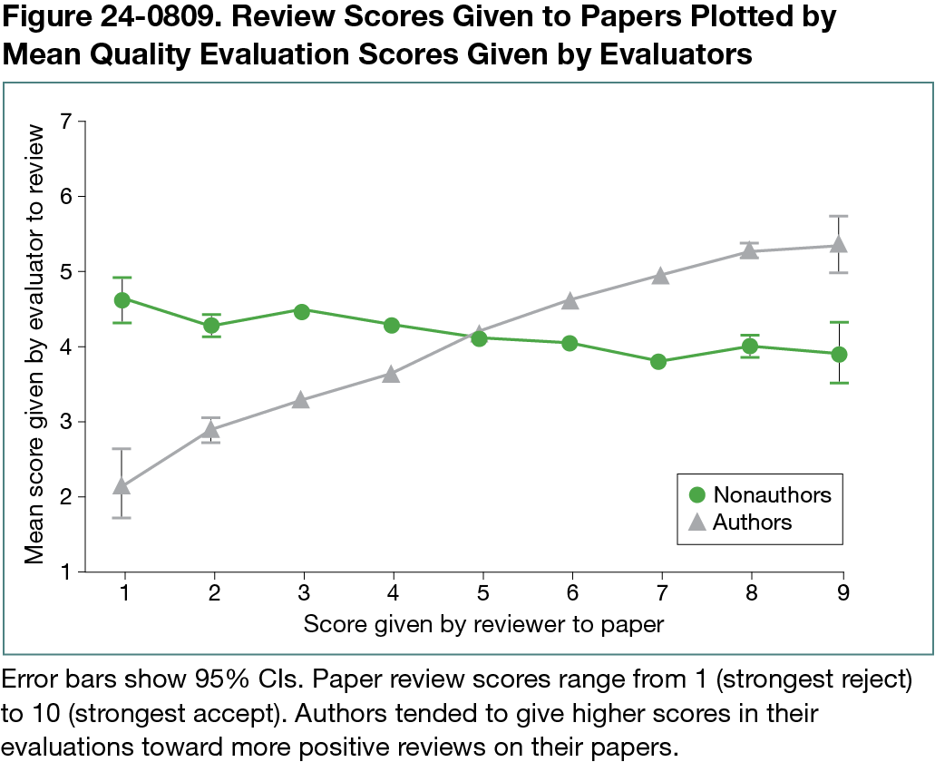 Evaluators exhibited a significant elongated review bias (P < .001). Elongated reviews received a mean score of 4.29 vs. 3.73 for original reviews. Each individual criterion also showed length bias (P < .05). Authors were positively biased toward reviews recommending acceptance (Figure 24-0809). Authors gave “reject” reviews a mean score of 3.24 compared with 4.65 on “accept” reviews. We also found a statistically significant bias in criteria scores (P < .001 for all criteria). The magnitude of error due to inconsistency, miscalibration, and subjectivity were similar for reviews of reviews and for reviews of papers at NeurIPS.