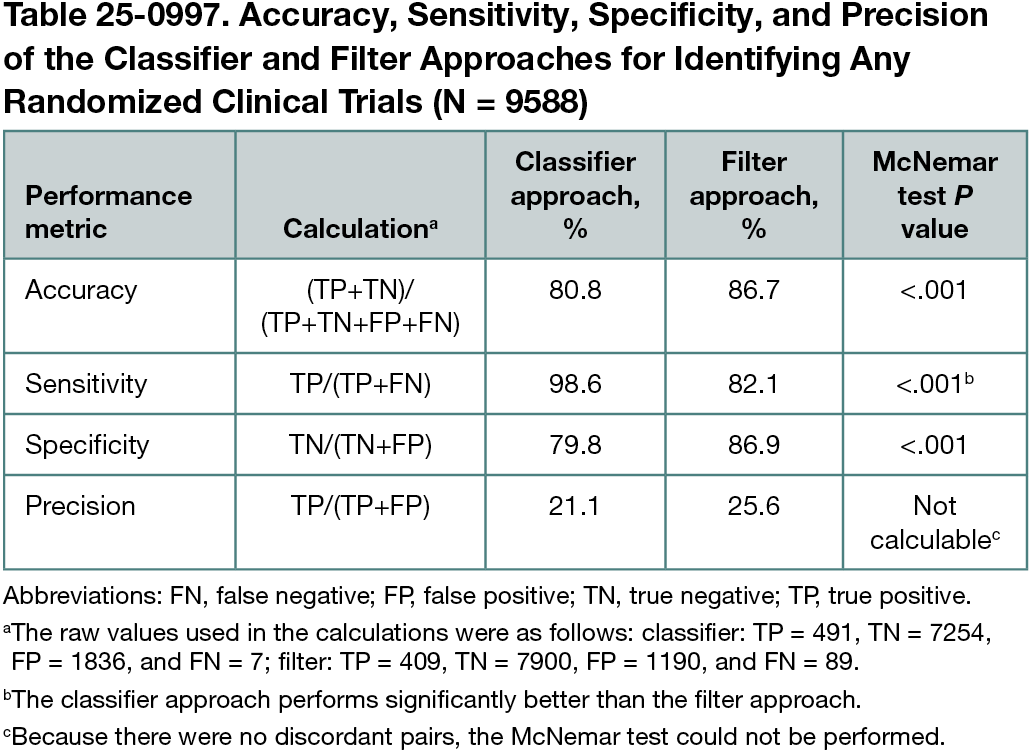 Prior to application of the classifier or filter, 9588 records were found for the FOP population. After application of the classifier or filter, 2327 and 1582 abstracts were identified as RCTs, respectively. At the end of the full-text review stage for each approach, the same 10 papers reporting on FOP RCTs were identified, demonstrating equal efficacy in terms of finding relevant papers in the context of a real-life SLR. However, when looking more generally at the classification of RCT vs non-RCT publications within the 9588 records (irrespective of ultimate inclusion in the SLR), sensitivity was significantly higher for the classifier vs the filter (McNemar test P < .001; Table 25-0997). The trade-off for higher sensitivity of the classifier was that it had a significantly lower specificity and therefore required 31% more time than the filter approach (25.79 vs 17.86 hours). This also resulted in a less positive user experience in effort and frustration domains.