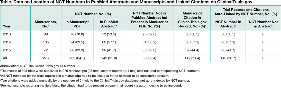 A total of 276 manuscripts (305 studies) were published in 140 unique journals. Half of the PubMed abstracts (143 of 276 [51.8%]) included the NCT number, and the citation was present in 142 of 276 (51.4%) of the ClinicalTrial.gov records (Table). Auto-indexing accounted for 140 of 142 (99.0%) of the citations on trial records; only 2 resulted from manual addition by the sponsor to the study records when the NCT number was not present in the abstracts. Errors or failures of the auto-indexing process appeared to occur for 3 abstracts published in 2013.