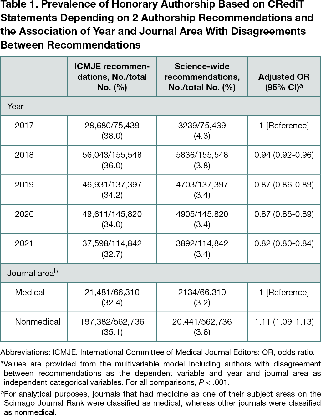 A total of 629,046 CRediT statements (1 per author) originating from 82,683 journal articles were included. Of the CRediT statements, 34.8% (n = 218,563; 95% CI, 34.7%-34.9%) indicated that the contributions provided by the author were not sufficient to qualify for authorship according to the ICMJE recommendations. Based on science-wide recommendations, 3.6% (n = 22,575; 95% CI, 3.5%-3.6%) of the authors did not qualify for authorship. Sensitivity analyses accounting for potentially ambiguous CRediT items provided similar results. The odds of fulfilling only 1 of the recommendations steadily decreased from 2017 to 2021 (Table 1), and authors of articles published in nonmedical journals had 1.11 times the odds to fulfill only 1 of the recommendations compared with authors of articles published in medical journals. Overall, 8394 authors (1.33%; 95% CI, 1.31%-1.36%) were “supply authors.” Their prevalence decreased in the years from 2017 to 2019 (difference in proportion, 0.6%; 95% CI, 0.57%-0.63%) but remained unchanged from 2019 to 2021 (0%; 95% CI, −0.02% to 0.02%).