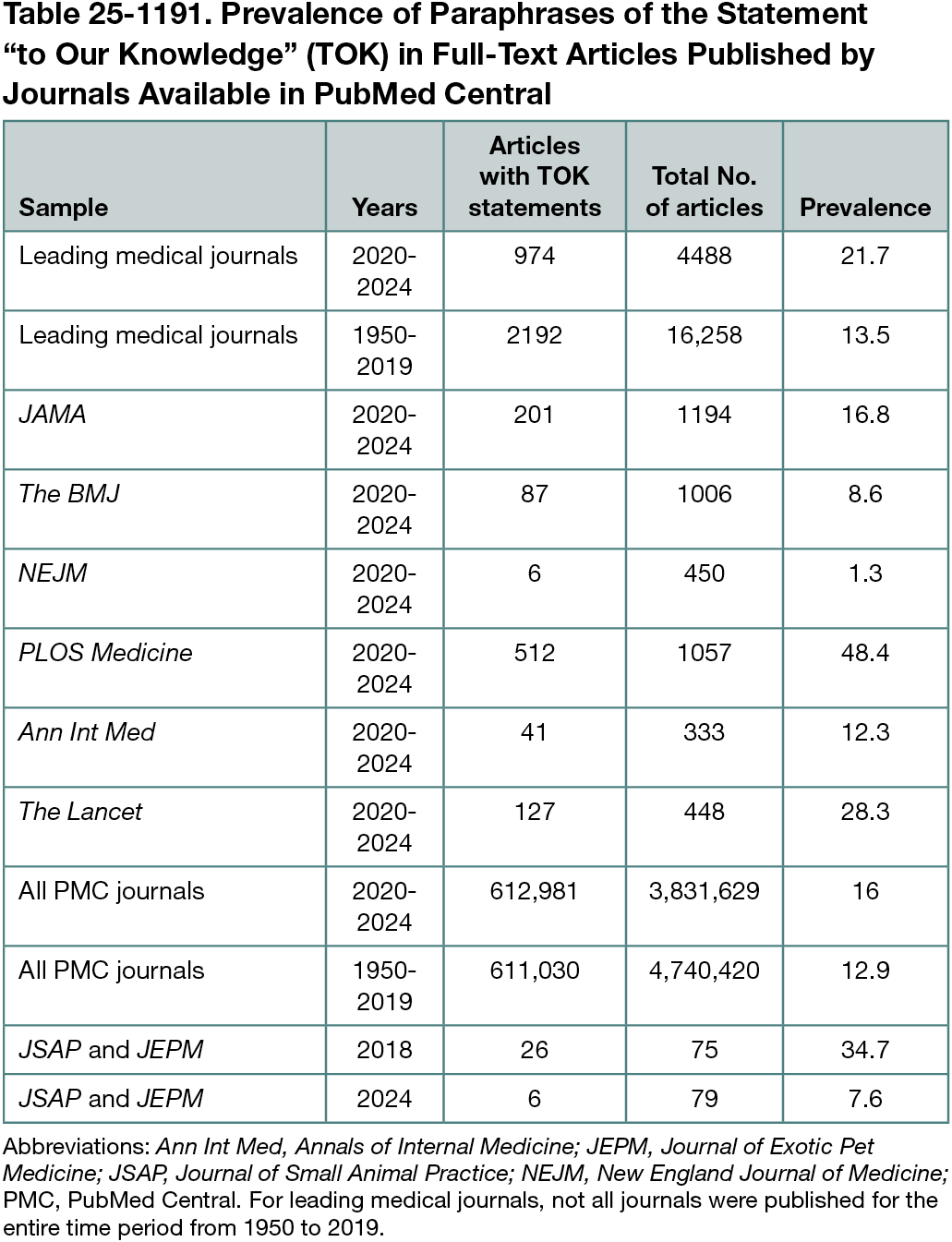 Full texts of articles available in PubMed Central (PMC) were searched using PMC’s phrase index for paraphrases of the statement TOK. Prevalence was measured in articles available in PMC published by 6 leading medical journals (The Lancet, NEJM, The BMJ, JAMA, Ann Int Med, PLOS Medicine) and in all articles in PMC in 2 time periods: January 1950 to December 2019 and January 2020 to December 2024 by 1 author (N.D.G.). To evaluate the search strategy, all articles published in 2024 in The Lancet with full text available in PMC (N = 43) were manually screened for TOK and compared with results of the engine search. To evaluate how often TOK was reported, all The Lancet research articles published in 2024 (N = 166) were manually screened. In 2 journals, Journal of Small Animal Practice (JSAP) and Journal of Exotic Pet Medicine (JEPM), an intervention to advise authors against use of these phrases and in favor of a scoping search of the literature was implemented in 2020, and TOK prevalence was measured in 2018 and 2024.