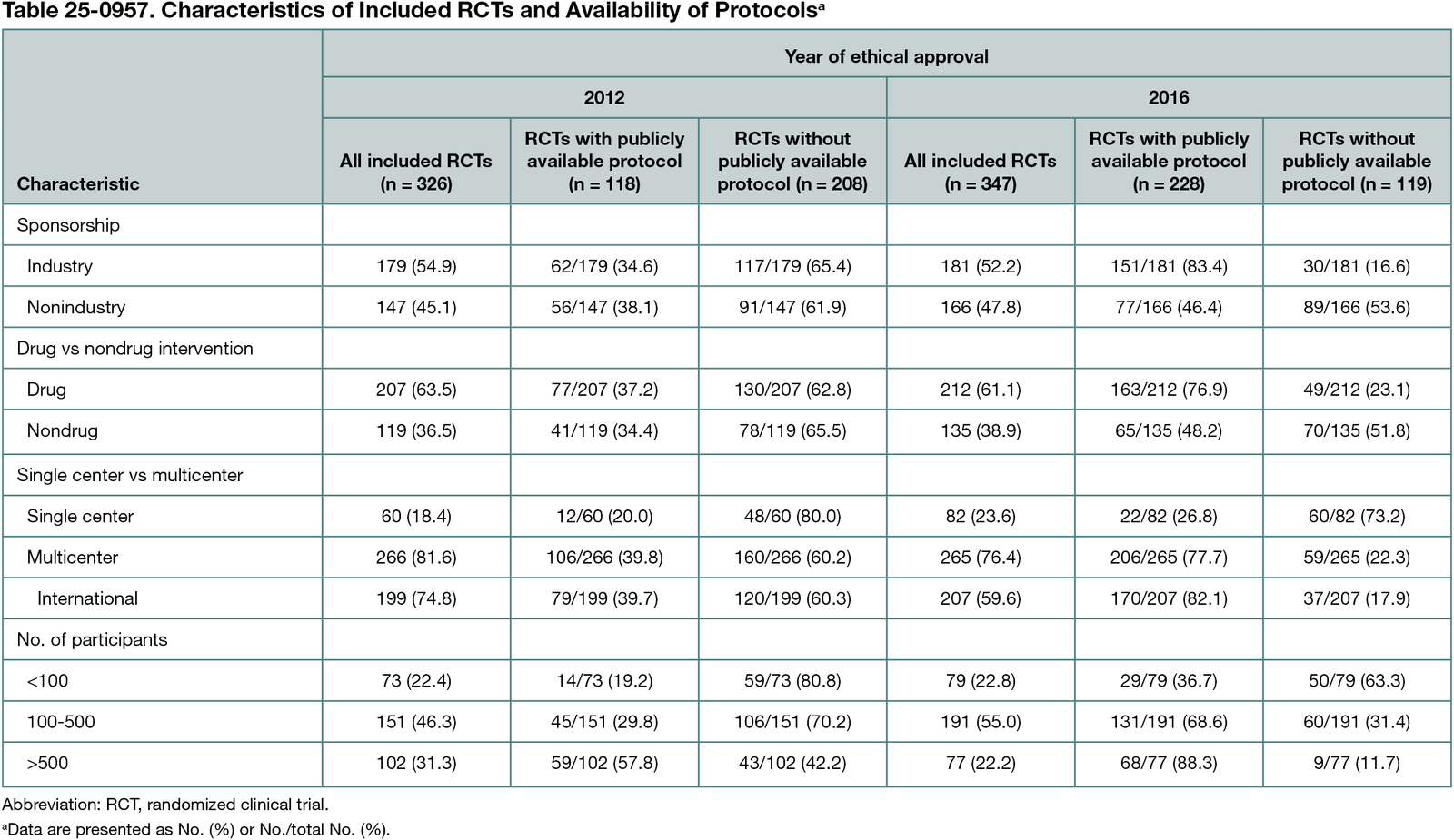 Of 347 included RCTs, 228 (65.7%) had an available protocol (Table 25-0957); 150 protocols (43.2%) were available as files on trial registries, 91 (26.2%) as supplementary material to a result publication, and 81 (23.3%) as peer-reviewed publications. Protocol availability improved over time (65.7% in 2016 vs 36.2% in 2012), particularly in industry trials (83.4% in 2016 vs 34.6% in 2012), but improved little in nonindustry trials (46.4% 2016 vs 38.1% 2012). In a regression model with pooled data from trials approved in 2012 and approved in 2016, trials with a medium sample size (100-500 participants) (odds ratio [OR], 2.12; 95% CI, 1.32-3.43; P = .001), trials with a large sample size (>500 participants) (OR, 6.12; 95% CI, 3.45-11.07; P < .001), and multicenter trials (vs single-center trials) (OR, 2.66; 95% CI, 1.59-4.52; P < .001) showed significantly higher odds of having an available protocol. A significant interaction term indicated dependence of sponsorship and year (OR, 0.13; 95% CI 0.06-0.27; P < .001).