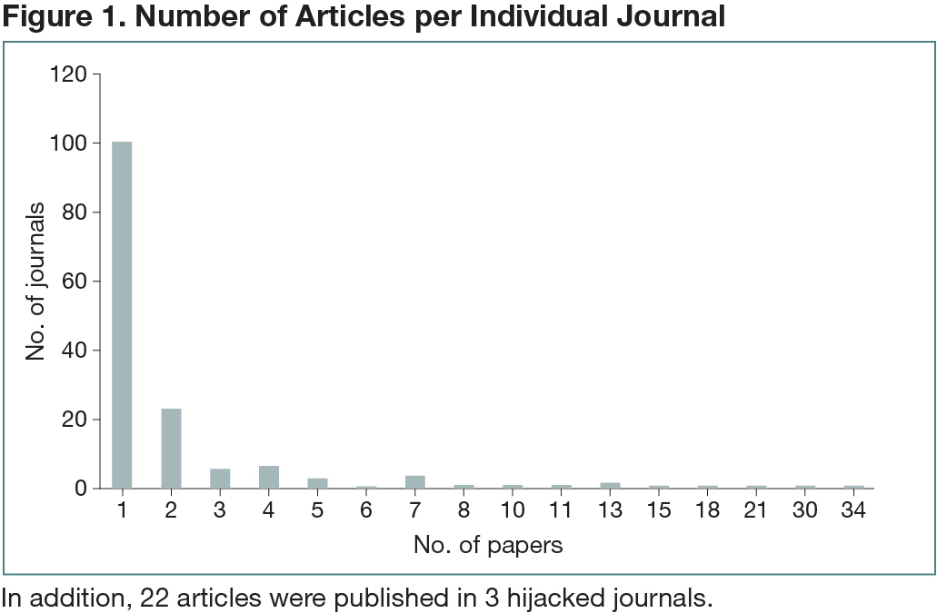 A total of 1009 offers were published during the study period, and the study identified at least 436 papers (43%) published in 154 journals potentially linked to the paper mill as of mid-March 2022; 22 of the papers appeared in 3 hijacked journals. More than 800 scholars from at least 39 countries purchased coauthorships from this paper mill. Fraudulent papers were published in predatory journals, journals of reputable publishers, and hijacked journals that represent cybercriminal publishers who clone titles and other metadata of legitimate journals (Figure 1). The list of identified papers can be accessed via a shared spreadsheet.2 This study found collaboration anomalies in questionable papers in which authors did not have common research interests, specialized in different disciplines, or were affiliated with different universities that did not focus research on the paper’s subject or might not specialize in the topic of the paper. There was also evidence of data fabrication in these papers. The study detected dishonest collaboration with journals (purchase of an entire issue) or editors who were listed as coauthors of fraudulent papers. This paper mill also applied a “one paper–one journal” principle, ie, submission of a problematic paper to an individual legitimate journal only once.