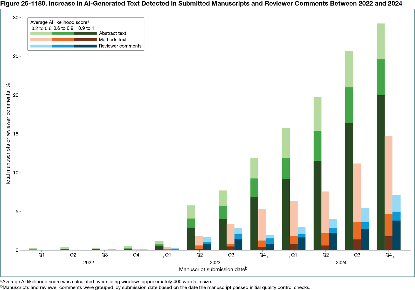 We analyzed 46,500 abstracts, 46,021 methods sections, and 29,544 reviewer comments. In 18,467 manuscripts submitted from 2021 through Q3 2022, only 7 abstracts—and no methods or reviewer comment text—were scored as highly likely to contain AI-generated text (AI likelihood score, 0.9 to 1). There were very few false positives (abstract: 0.22%, 40/18,467; methods: 0.07%, 13/18,303; reviewer comments: 0.03%, 4/12,908). Detection of AI-generated text in all 3 sources started increasing dramatically beginning in Q1 2023 after the public release of ChatGPT in November 2022 (Figure 25-1180). Detections in reviewer comments dropped by >50% (from 46 to 34) in Q4 2023 after the journals implemented a policy prohibiting use of genAI for peer review before resuming a linear upward trend. In aggregate, the presence of AI-generated text in 2024 varied greatly between abstracts (23%, 2749/11,959), methods text (10%, 1209/11,875), and reviewer comments (4.8%, 348/7211). There was also substantial journal-dependent variation, from 12% to 15% of abstracts at 3 journals (183/1464, 29/214, 32/214) to 28% to 33% of abstracts at 2 journals (203/716, 438/1342). Authors affiliated with institutions in English-speaking countries were less than half as likely to use genAI compared with other authors. The presence of AI-generated text was associated with a substantially higher rejection rate before peer review regardless of institution location. There was a slight association of AI-generated text with lower-rated reviewer comments.
