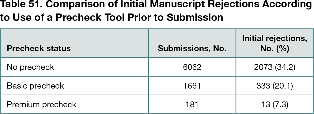 The use of a precheck tool to assist authors in identifying language errors and missing manuscript elements prior to submission was associated with a decrease in initial manuscript rejections (Table 51).