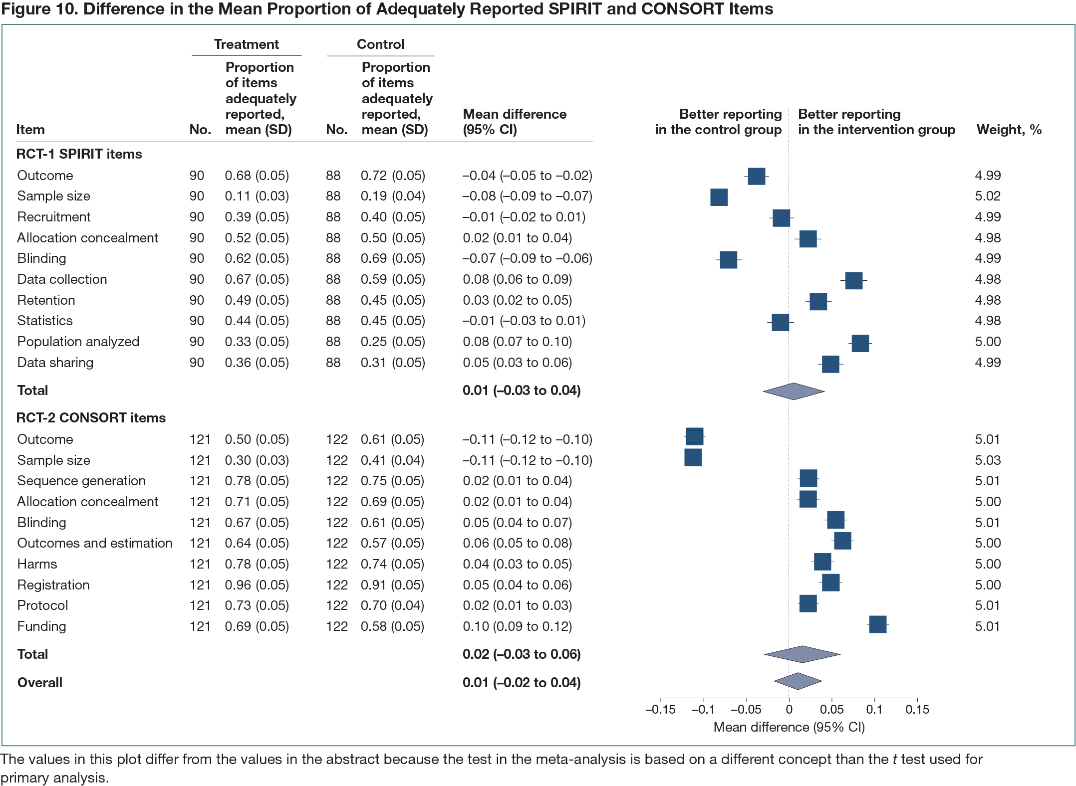 In RCT-1, 245 manuscripts were randomized. Of those, 178 were published (90 intervention; 88 control). A mean proportion of 46.1% (95% CI, 41.8%-50.4%) of the 10 SPIRIT items were adequately reported in the intervention group and 45.6% (95% CI, 41.7%-49.4%) in the control group (mean difference, 0.5%; 95% CI, −5.2% to 6.3%) (Figure 10). In RCT-2, of the 511 randomized manuscripts, 243 were published (121 intervention; 122 control). A total of 67.4% (95% CI, 63.8%-71.1%) of the 10 CONSORT items were adequately reported in the intervention group and 65.9% (95% CI, 61.9%-69.9%) in the control group (mean difference, 1.5%; 95% CI, −3.8% to 6.9%) (Figure 10).