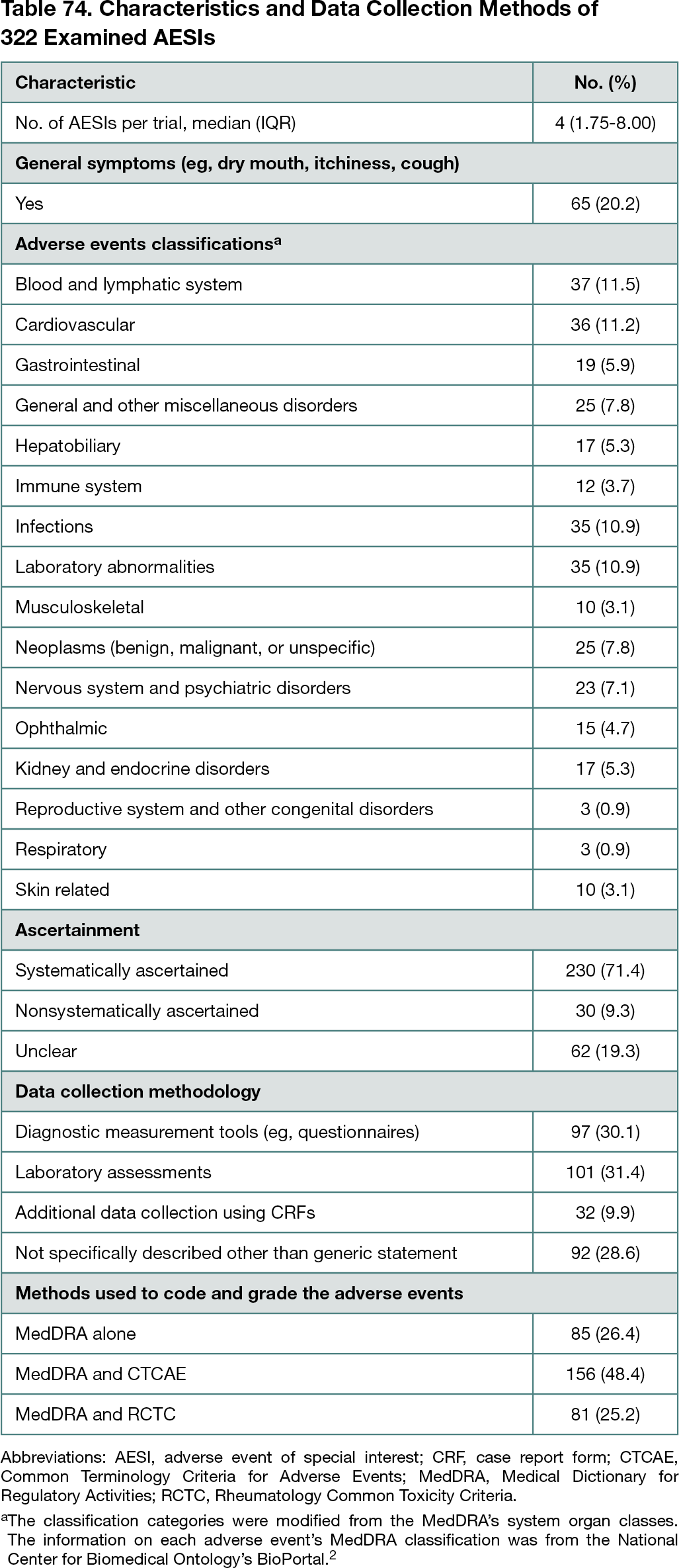 A total of 107 new molecular entities and biologic license applications approved in 2018 to 2019 were screened, and 31 drugs (29.0%) had publicly available underlying trial documents. Of 64 pivotal trials, AESIs were described in 54 clinical study reports (84.4%; 95% CI, 73%-92%), 33 study protocols (51.6%; 95% CI, 39%-64%), and 10 journal publications (15.6%; 95% CI, 8%-27%). A total of 322 AESIs were identified from trial documents. The median number of AESIs per trial was 4. Mainly using diagnostic measurement tools and laboratory assessments, 71.4% of AESIs (230 of 322; 95% CI, 66%-76%) were systematically ascertained, and 9.3% (30 of 322; 95% CI, 6%-13%) were nonsystematically ascertained. The ascertainment method of 19.3% (62 of 322; 95% CI, 15%-24%) was unclear (Table 74).2 In 38 of 54 trials (70.4%; 95% CI, 56%-82%), at least 1 AESI was nonsystematically ascertained and/or had unclear ascertainment methodology. From EMA PRAC reports, 1 newly signaled adverse event was identified and systematically ascertained using targeted questions in case report forms.